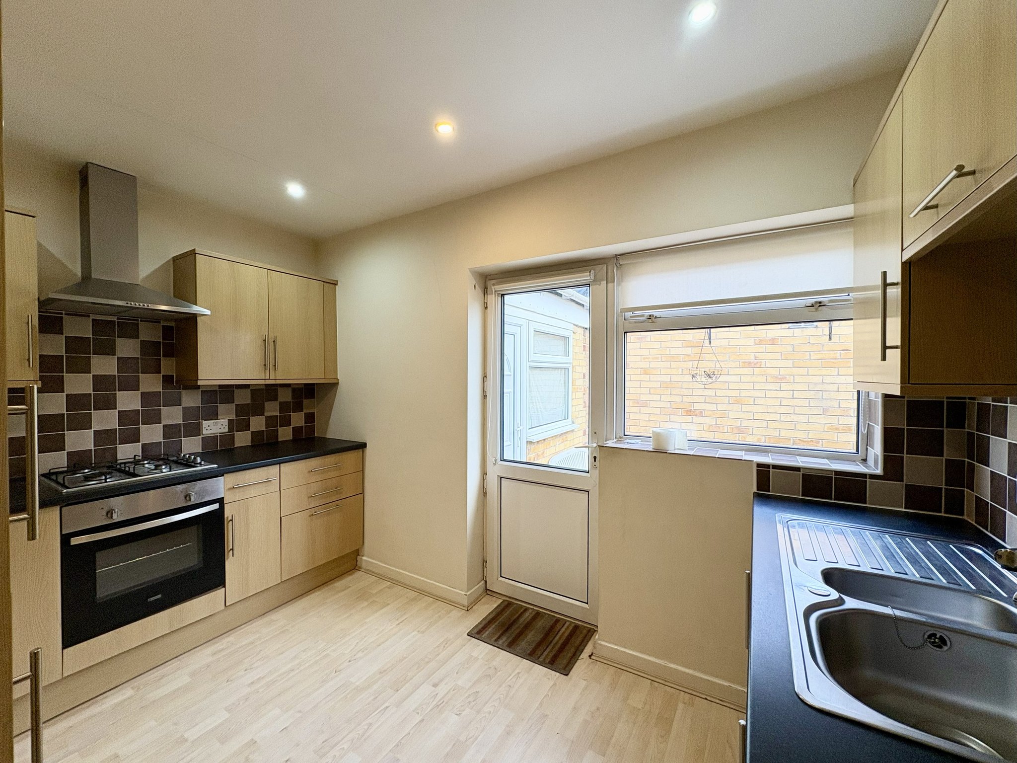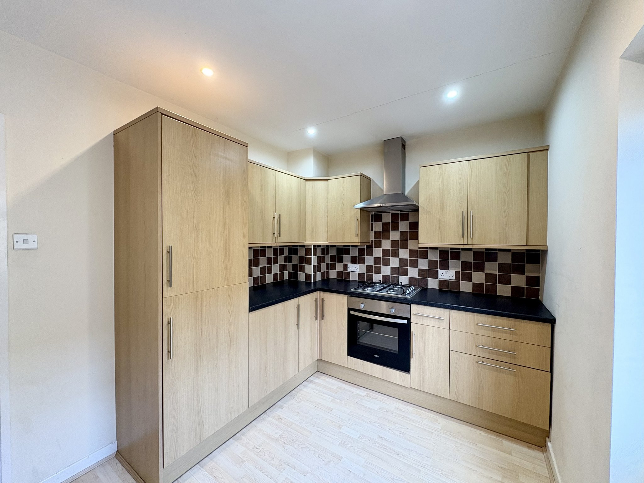 A fully fitted kitchen with a range of floor and wall units with integrated appliances to include oven, hob, extractor fan, dishwasher, fridge, freezer and washing machine. Tiled splash backs, wood effect laminate floor, side aspect window and door to rear garden, radiator and spot lighting.