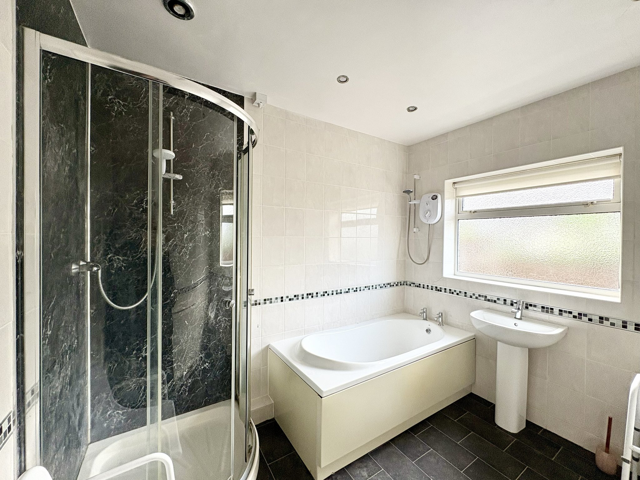 The fully tiled family bathroom has a suite comprising bath tub and walk in shower, hand basin and wc. There is a side aspect window, vinyl floor covering, spot light and radiator.