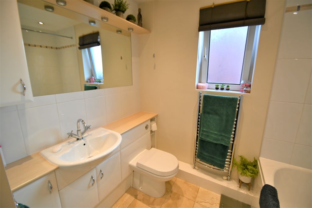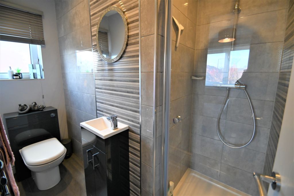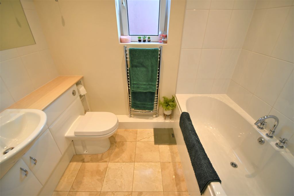 The mostly tiled en suite with walk in shower has recently been upgraded. Handbasin with cupboard below, W/C, chrome heated towel radiator, side aspect window, spot lighting and finished with tiled flooring.