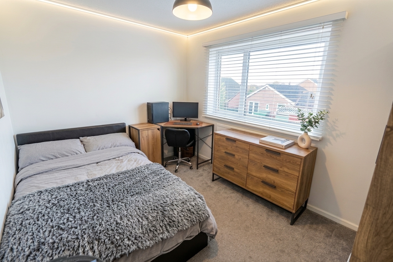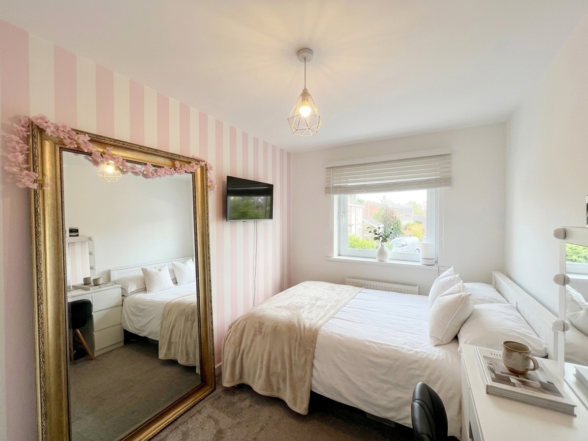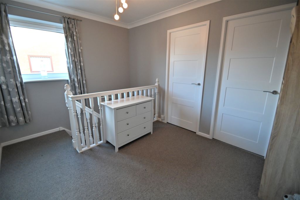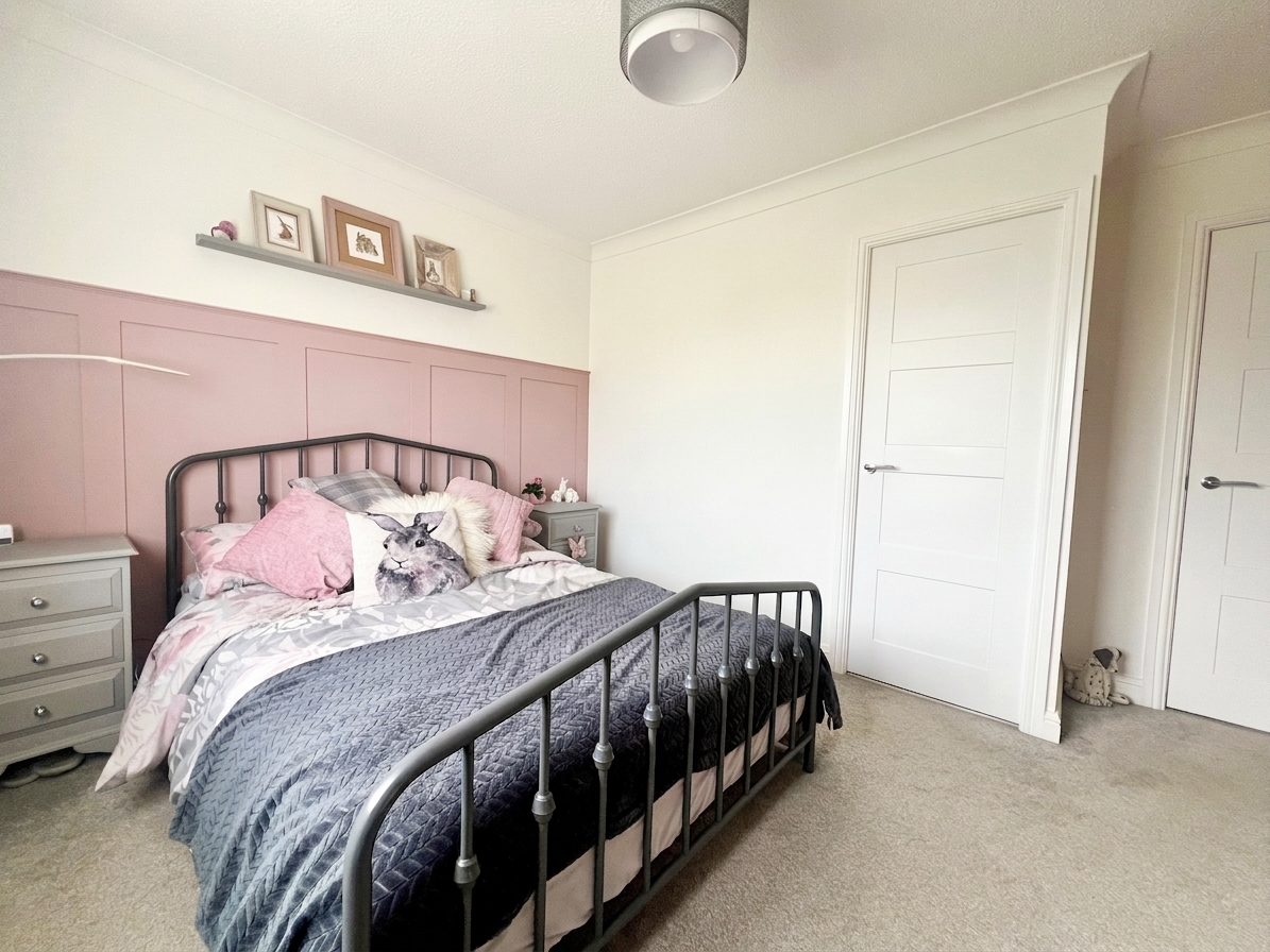 A double, front facing bedroom with built in wardrobe. Finished with a grey carpet, single pendant light fitting and central heating radiator.