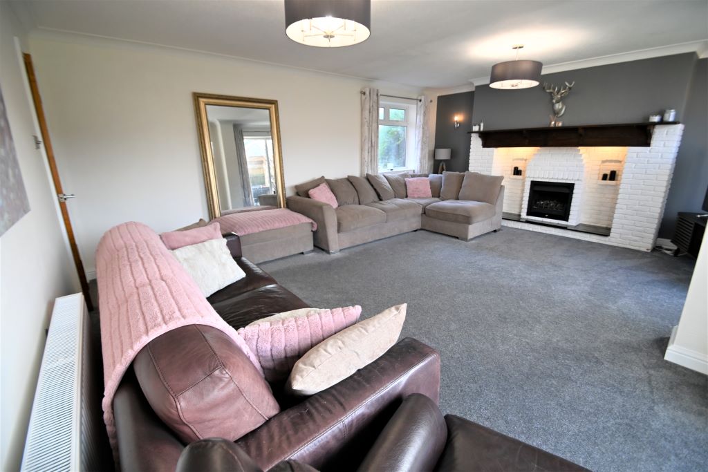 A wonderfully spacious rear reception area offering room for all the family. A large feature fireplace with gas fire adds a focal point and the room benefits from a rear aspect window, floor to ceiling window and sliding patio doors, giving access and views to the garden. Finished with a grey carpet, central heating radiators, 2 pendant light fittings and wall lighting.