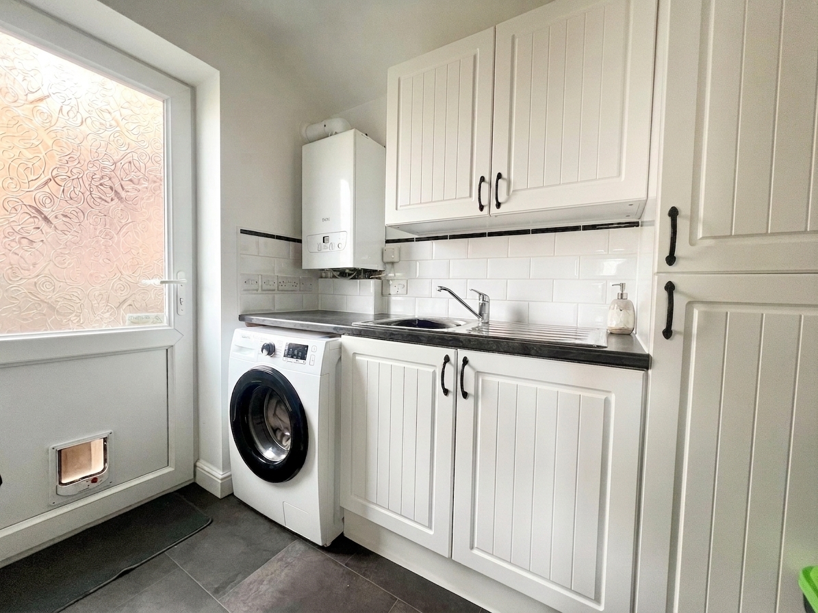 Accessed from the kitchen is a functional utility room. Offering a mix of wall and floor units, sink with mixer tap, plumbing for a washing machine and the combi boiler. There is a side access door, central heating radiator, pendant light fitting and tiles to the floor.