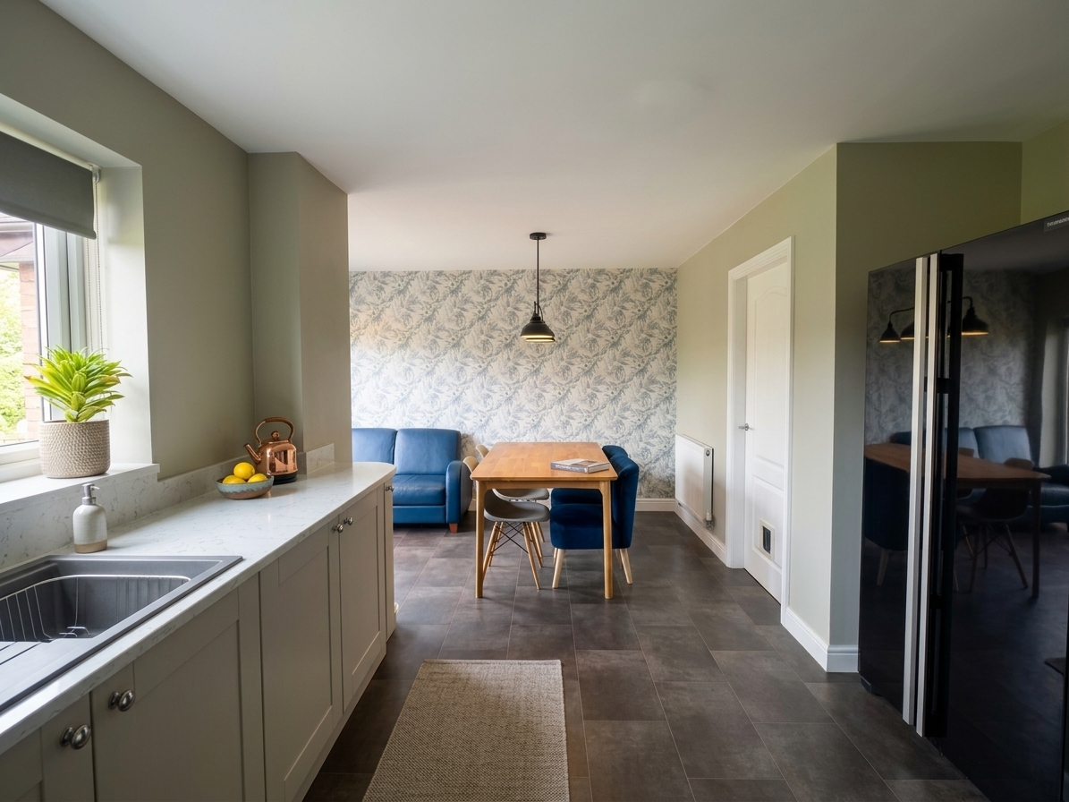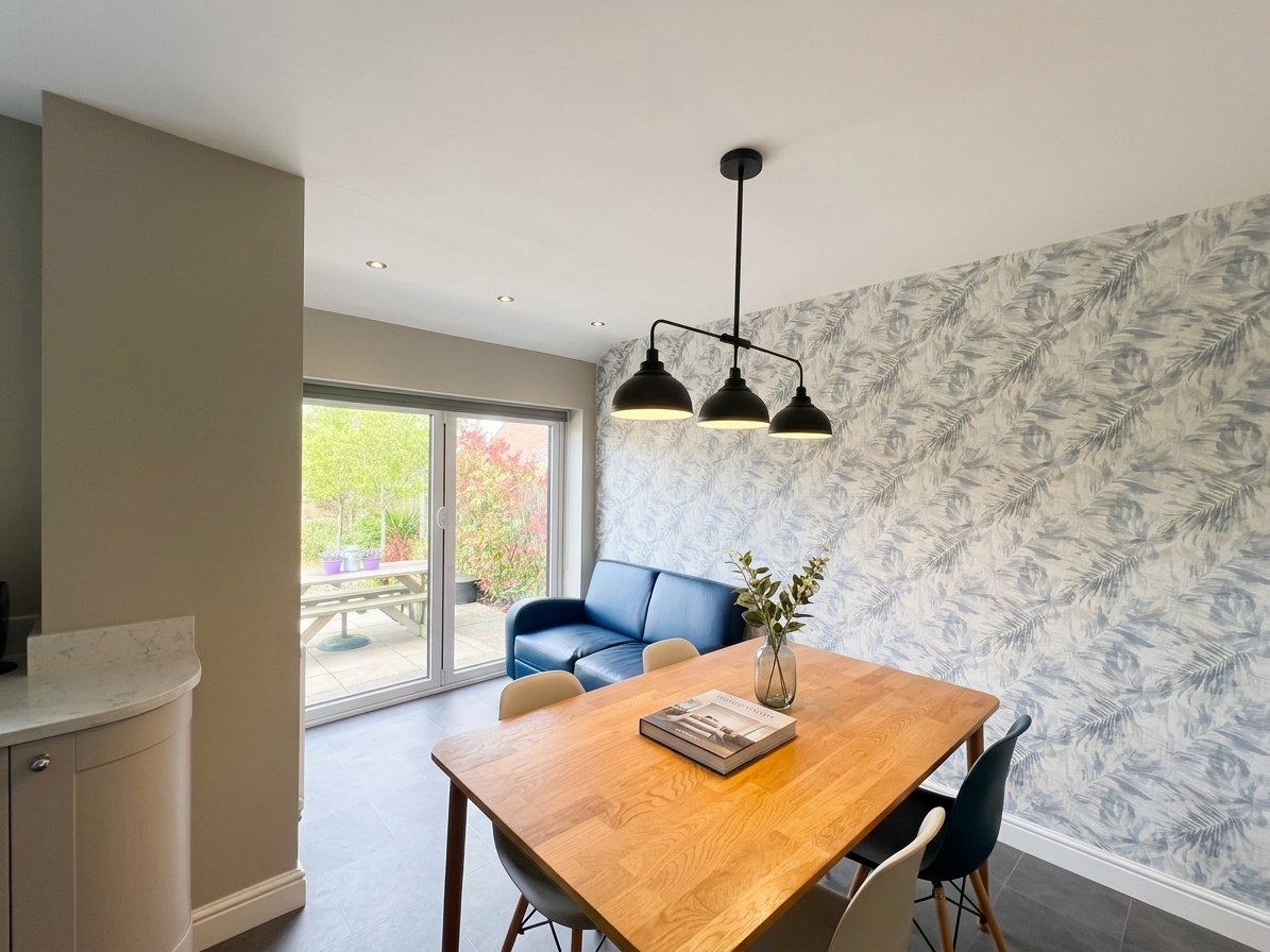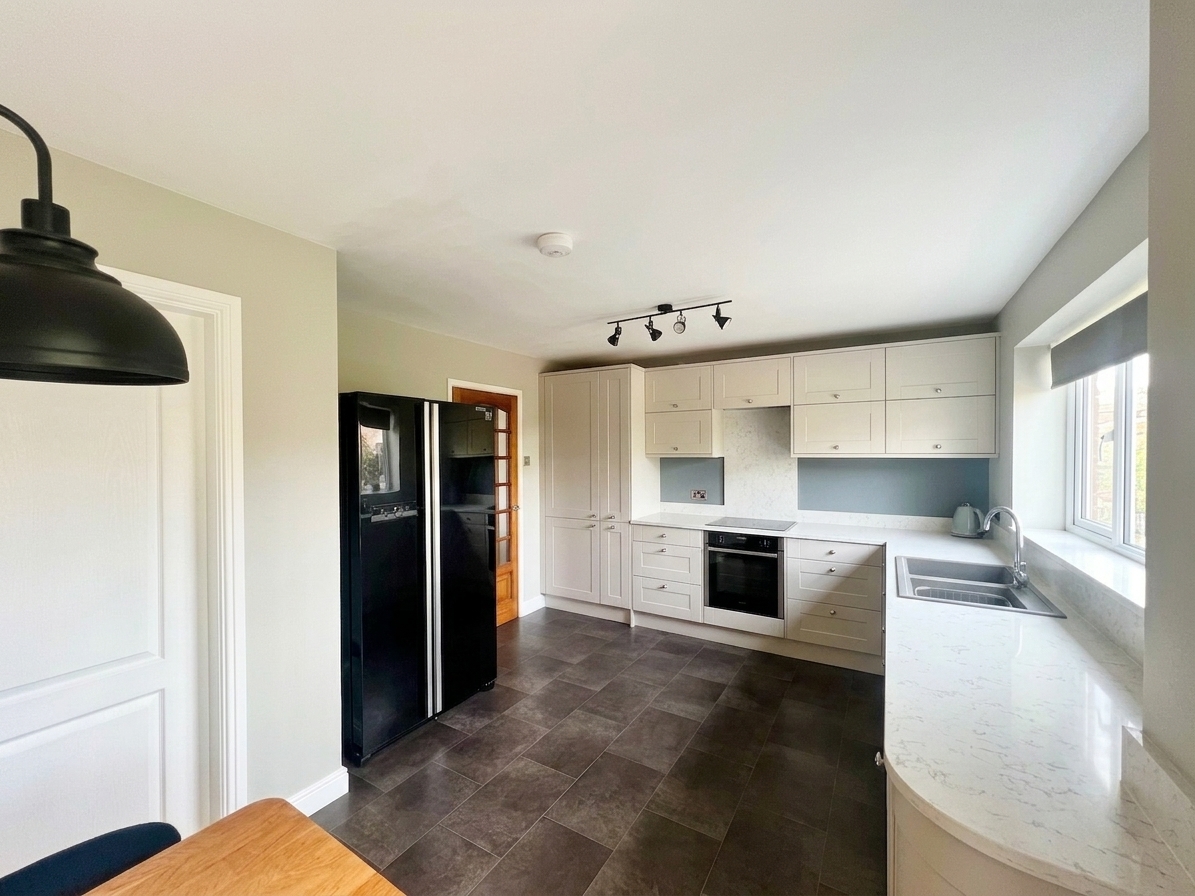 Recently upgraded, this contemporary kitchen/diner is the hub of the home. Grey Shaker style wall and floor units with contrasting marble effect work surfaces and upstands, offering a range of built in appliances including an induction hob, electric oven and extractor fan, space for an American style fridge/freezer and composite sink with mixer tap. There is space for a dining table and bi folding doors offer access to the rear garden. There is a rear facing window, 2 pendant light fittings and spot lighting, central heating radiators and tiles to the floor.