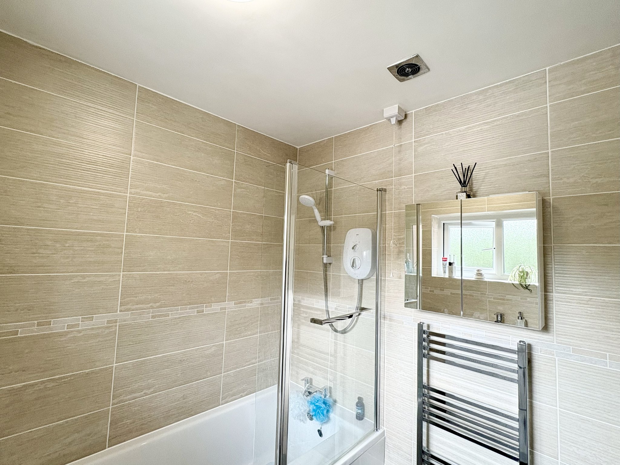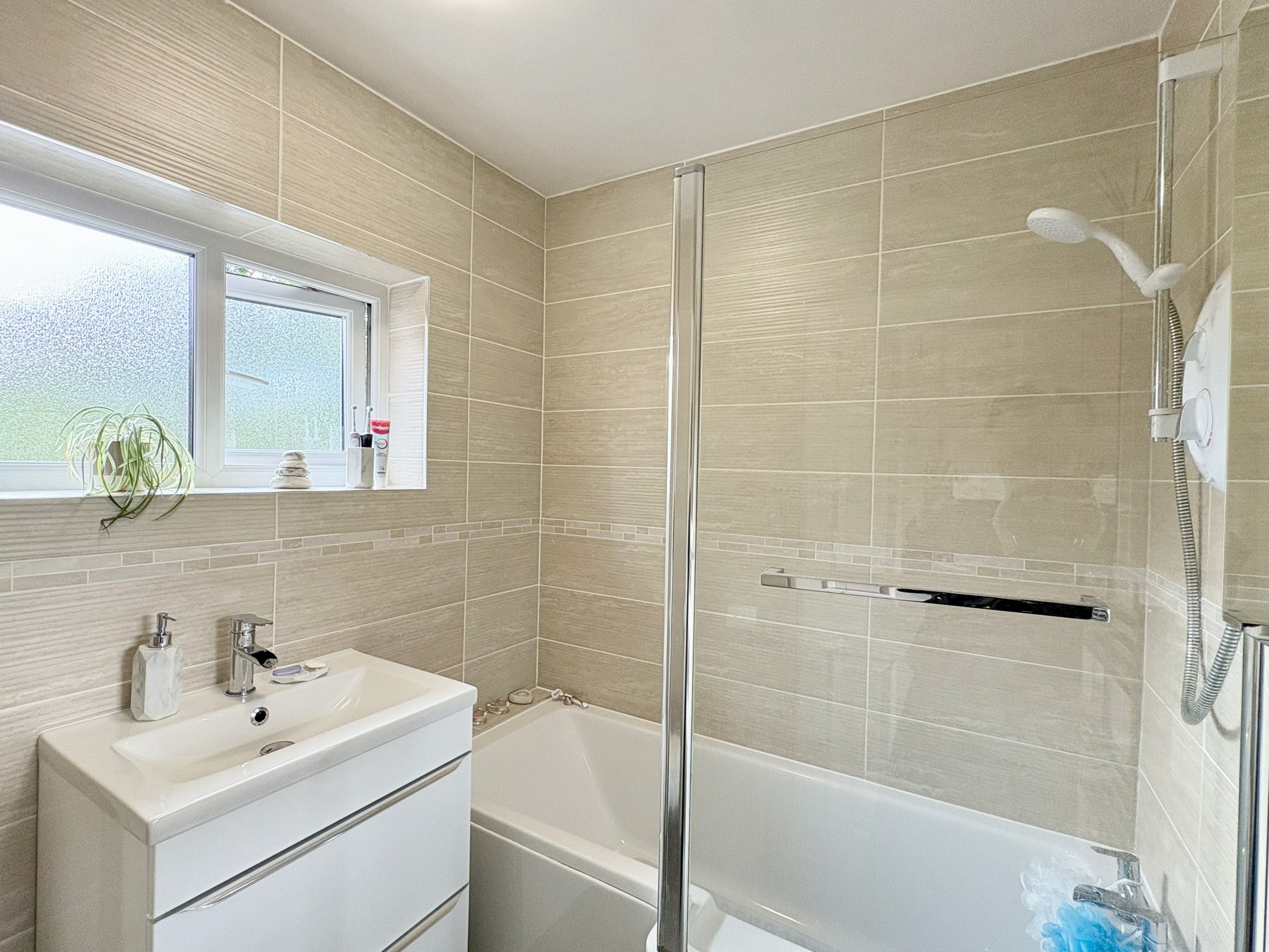 Bathroom - Fully refurbished to a high standard, this modern family bathroom now includes a white three-piece suite, with panelled bath and rainfall-style shower over, glass screen, low flush WC and hand basin with vanity unit. Finished with stylish full-height tiling, modern vinyl flooring, chrome heated towel rail, spot lighting and an obscure glass side window.