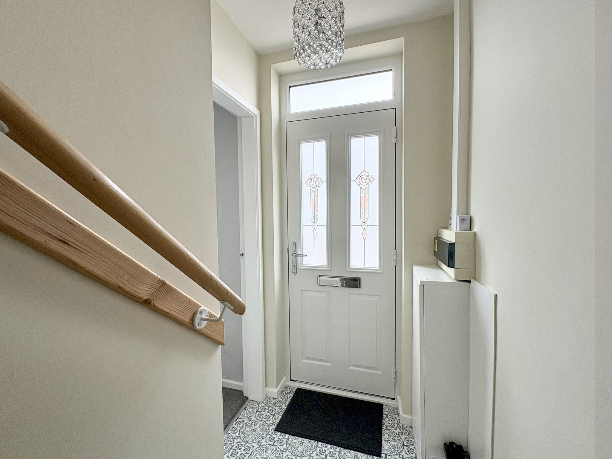 Entrance Hall - A welcoming entrance with vinyl flooring, neutral decor and a staircase rising to the first floor. A single pendant light fitting and side access to the lounge.