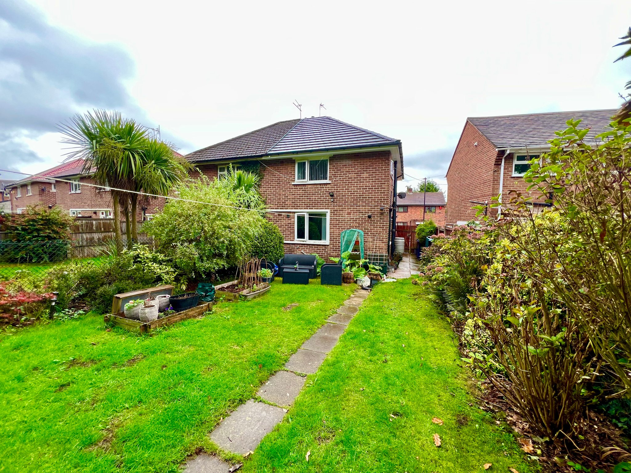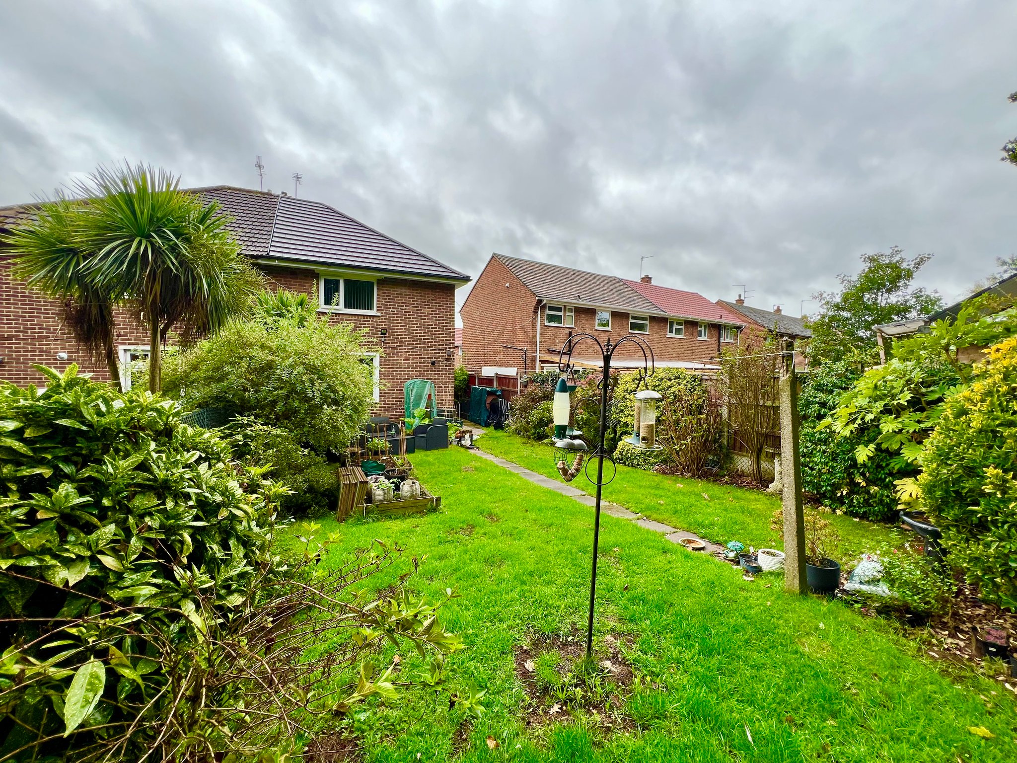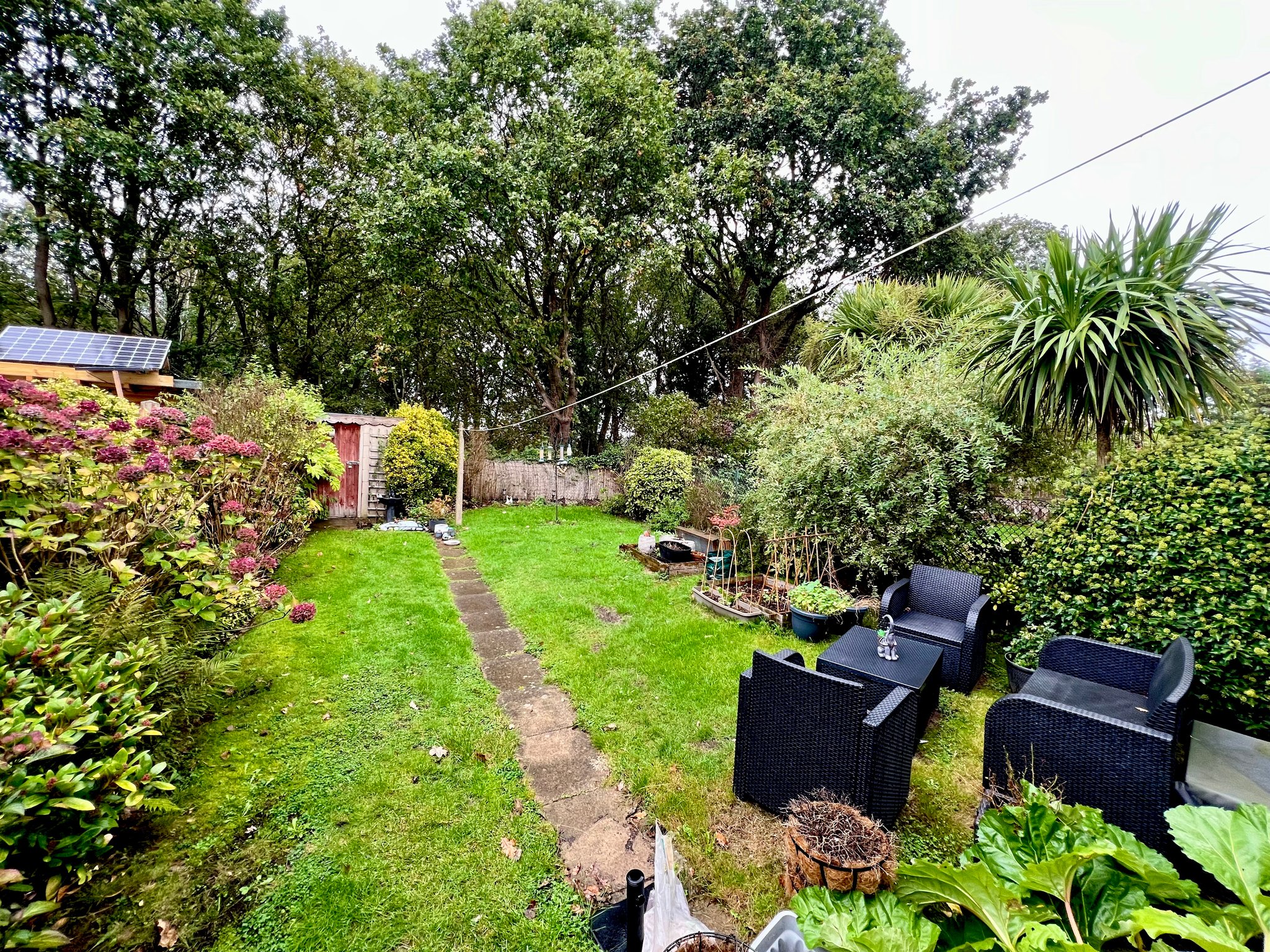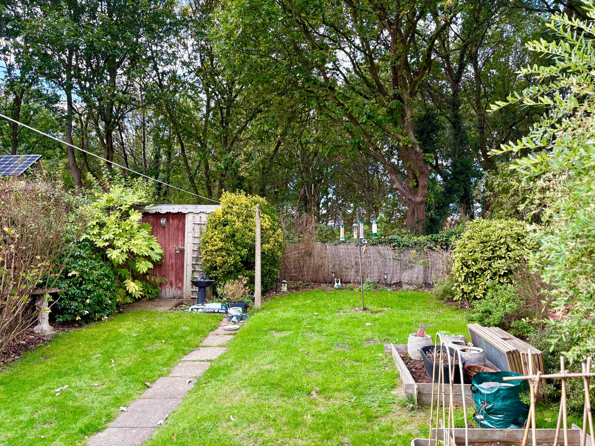 To the front, the garden is low maintenance with decorative stone, shrubs and paved pathways, all secured by a wrought iron fence and gates. There is off-street parking available directly in front of the house. A side access gate leads to a generously sized and private rear garden — mostly laid to lawn with well-established shrub borders. A timber garden shed provides additional external storage.