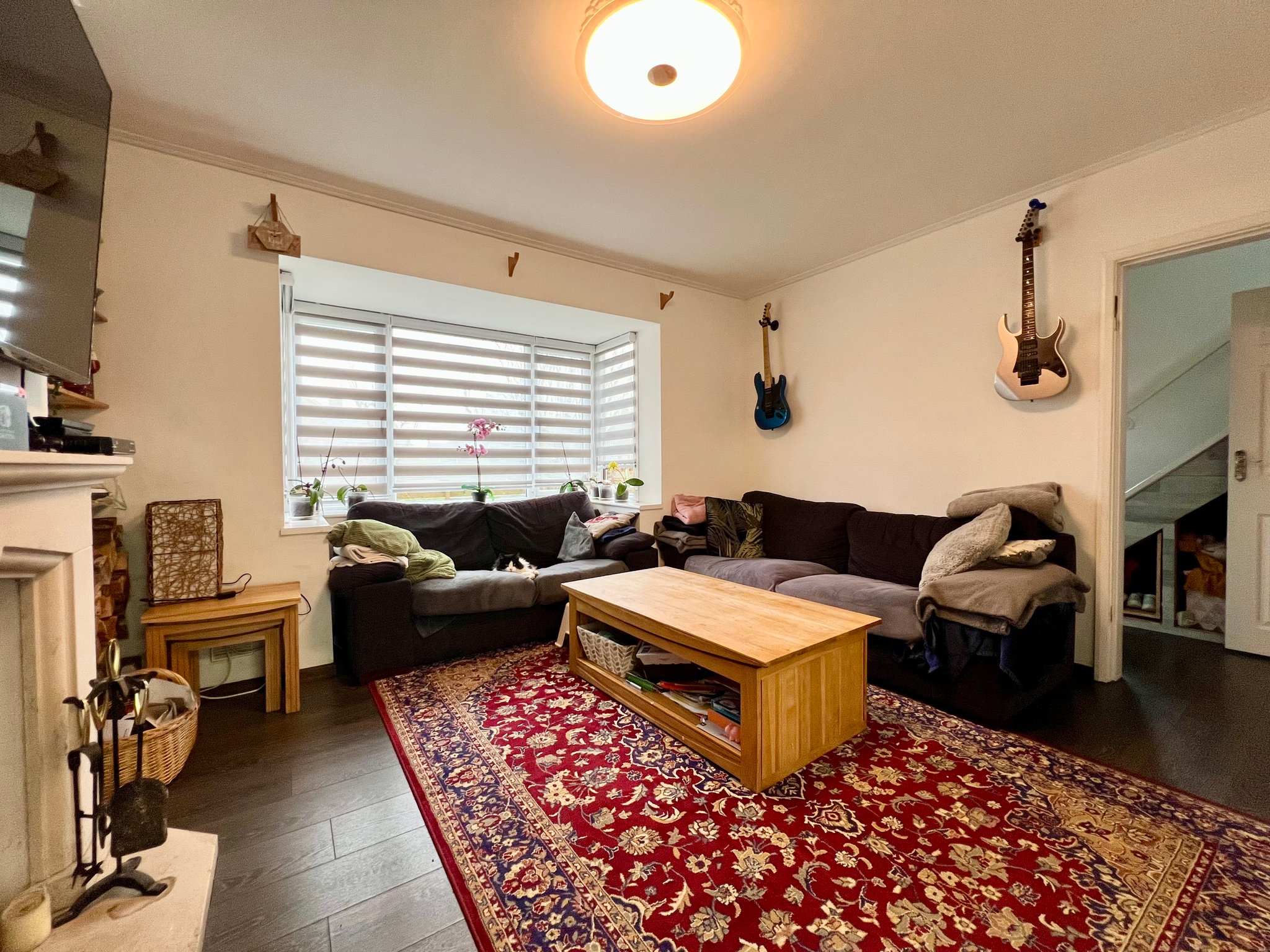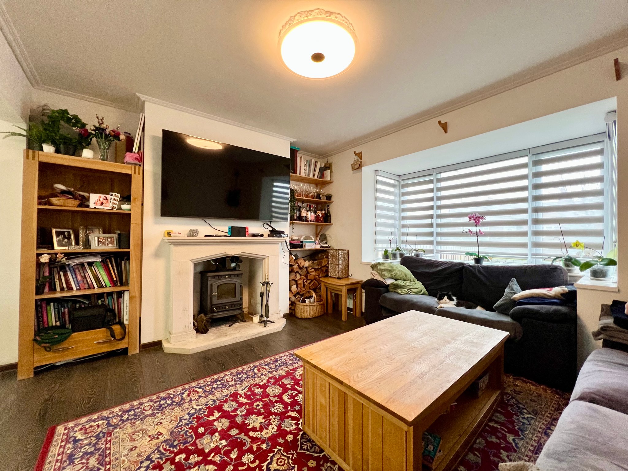 The bay-fronted living room is a generous and inviting reception room, featuring a square double glazed bay window to the front elevation. A multi-fuel wood burner with Portuguese sandstone surround and hearth creates an attractive focal point, complemented by laminate flooring and radiator. The room flows openly through to the dining room, enhancing the sense of space across the ground floor.