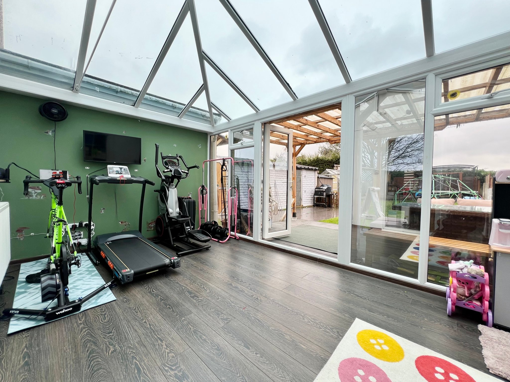 The large conservatory is a superb additional reception space, enjoying extensive glazing, radiator and French doors onto the garden. This bright and versatile room provides the perfect setting for relaxing, entertaining or enjoying views over the rear garden all year round. Currently used as a gym and play room.