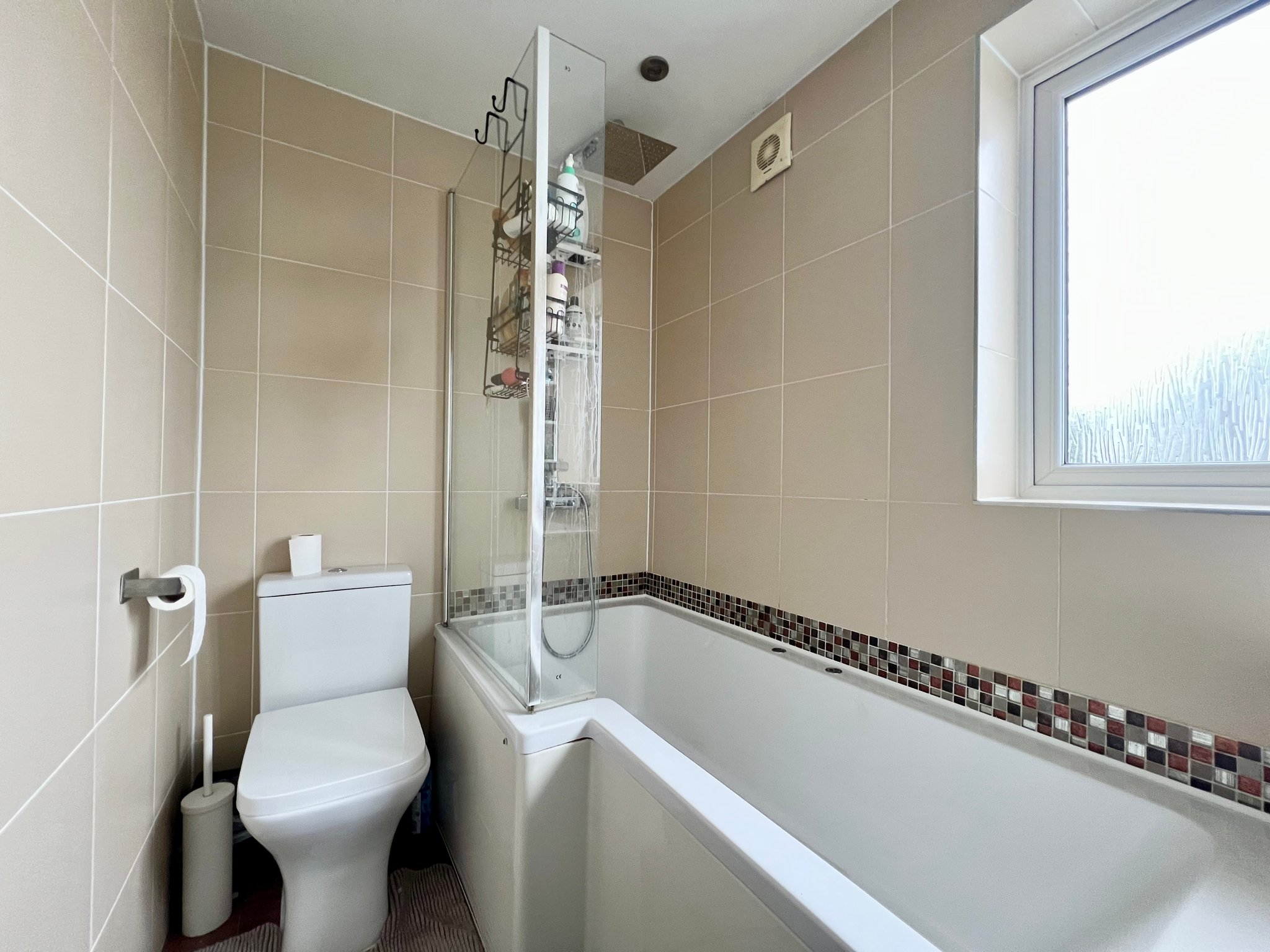 The family bathroom is fitted with a white three-piece suite comprising panelled bath with shower over, pedestal wash hand basin and low flush WC. The room is finished with fully tiled walls, tiled floor, heated towel rail, inset spotlights and rear aspect double glazed window.