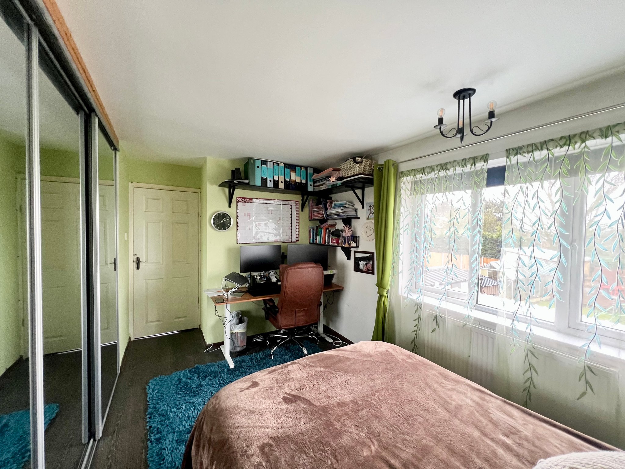 Bedroom two overlooks the rear garden and includes a double glazed window, radiator, laminate flooring and built-in wardrobe with hanging rail and additional storage cupboards above.