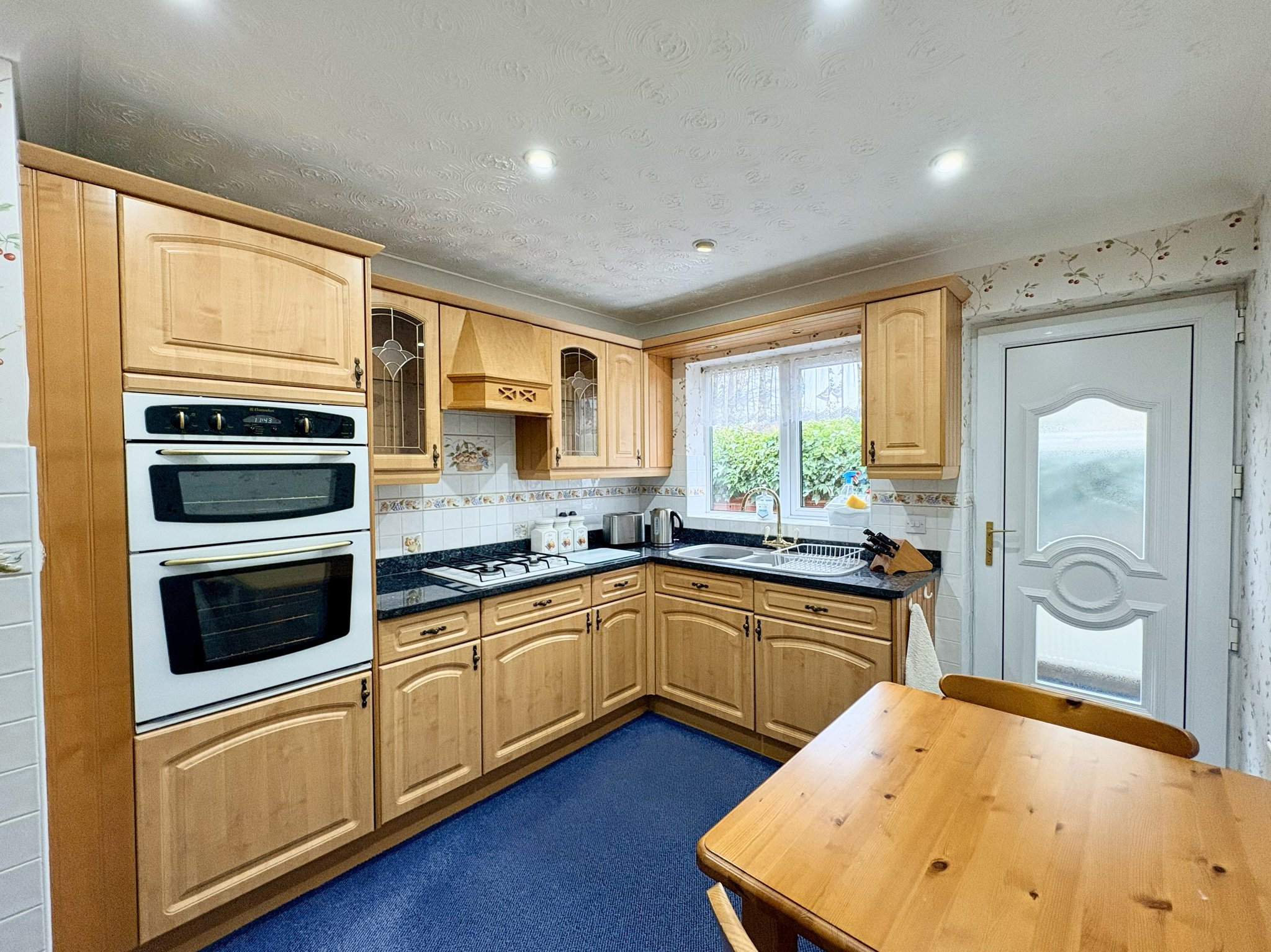 The kitchen is functional, well maintained and fitted with a range of wall and floor units with granite work surfaces. There is a sink with mixer tap, tiled splashbacks and integrated appliances including an electric oven, grill, hob and fridge. The kitchen features carpeted flooring, a side-aspect window, spot lighting and a door leading through to the utility room.