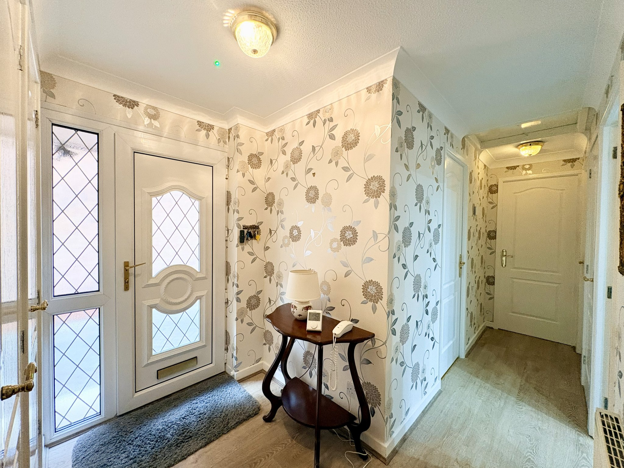 The covered front entrance opens into the main hallway, which is fitted with wood-effect laminate flooring, a central heating radiator and two large storage cupboards, along with a further cupboard housing the combi boiler installed in 2022 and benefitting from a ten-year warranty. The hallway also features two single pendant light fittings and provides access to the main living accommodation, kitchen, bedrooms and shower room.
