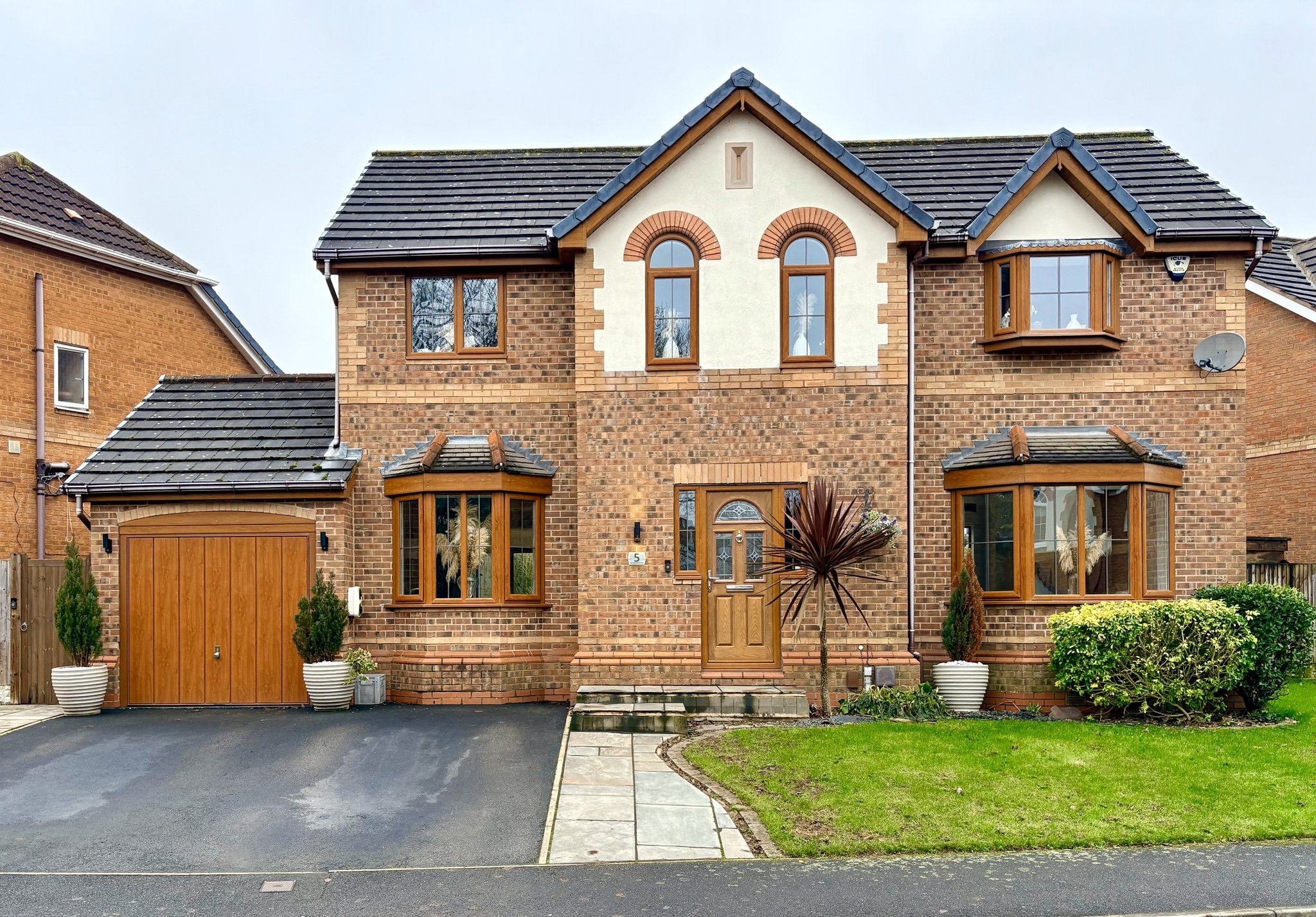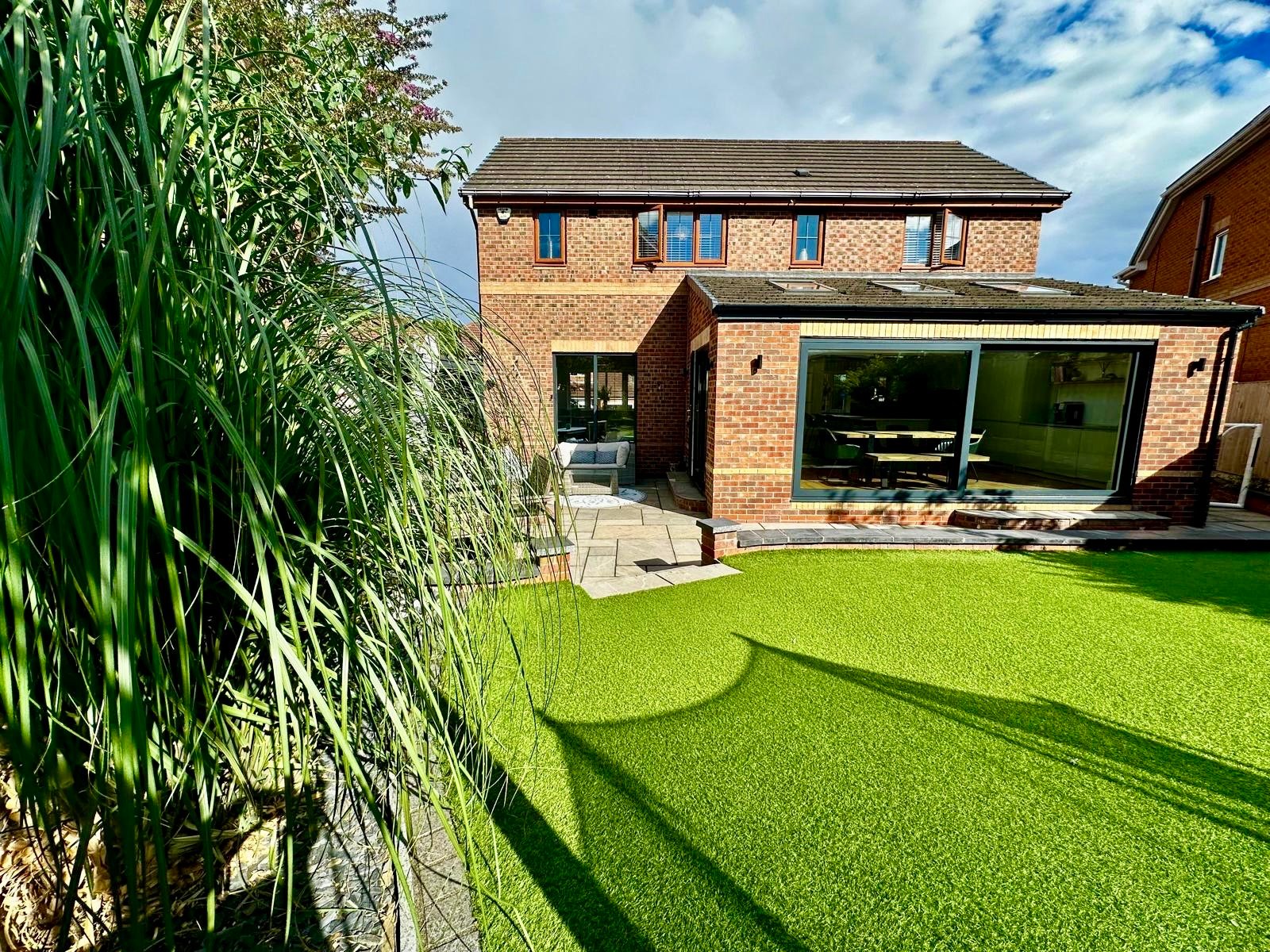 To the front of the property is a low-maintenance garden with a grass lawn, double driveway and garage with power and lighting. The garage has been converted to provide storage space and a gym and could easily be converted back to a traditional garage if required. The landscaped rear garden has been thoughtfully designed to offer a low-maintenance and family-friendly outdoor space. It features a patio area ideal for outdoor dining and entertaining, artificial grass for ease of upkeep and mature shrub borders providing colour and privacy.