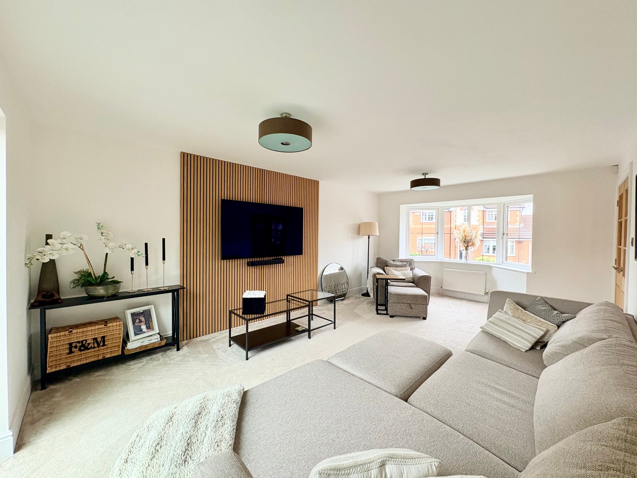 Lounge - The dual aspect lounge offers a refined yet comfortable retreat, featuring carpet to the floor, a front bay window and rear sliding doors opening directly onto the patio. The room benefits from two radiators, two single pendant light fittings and attractive media wall feature, creating an ideal space for relaxing as a family or enjoying quiet evenings.