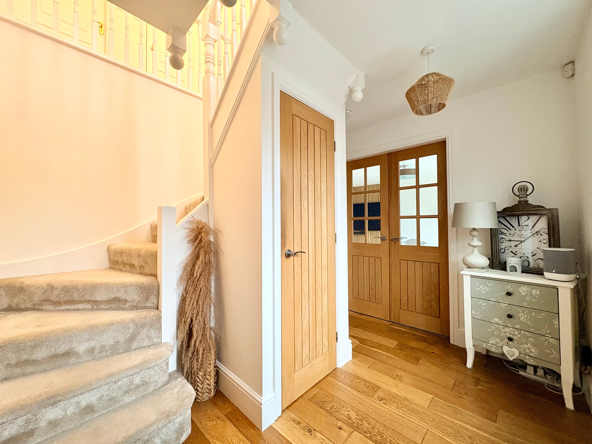 Entrance Hall - The entrance hall creates an immediate sense of quality and space, featuring an engineered wood floor and a useful storage cupboard. It provides access to the lounge, the impressive kitchen and family living space, the ground floor WC and the staircase rising to the first floor, making it both welcoming and highly practical for family living.