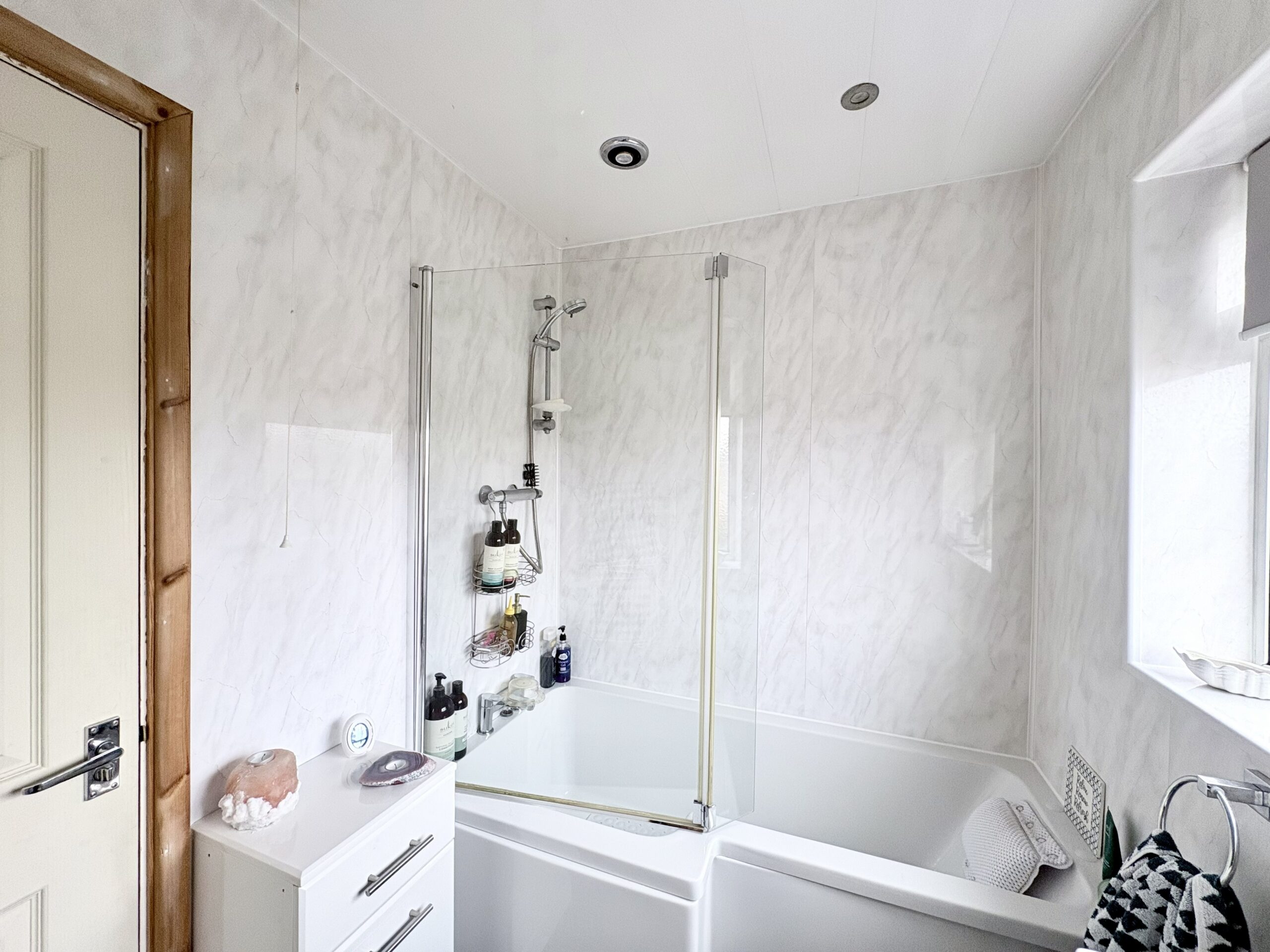 Family Bathroom - Fitted with WC, wash hand basin and bath with pvc panel surround, shower over and screen. There is a rear-facing obscure double glazed window, heated towel rail, spotlighting and vinyl floor covering.