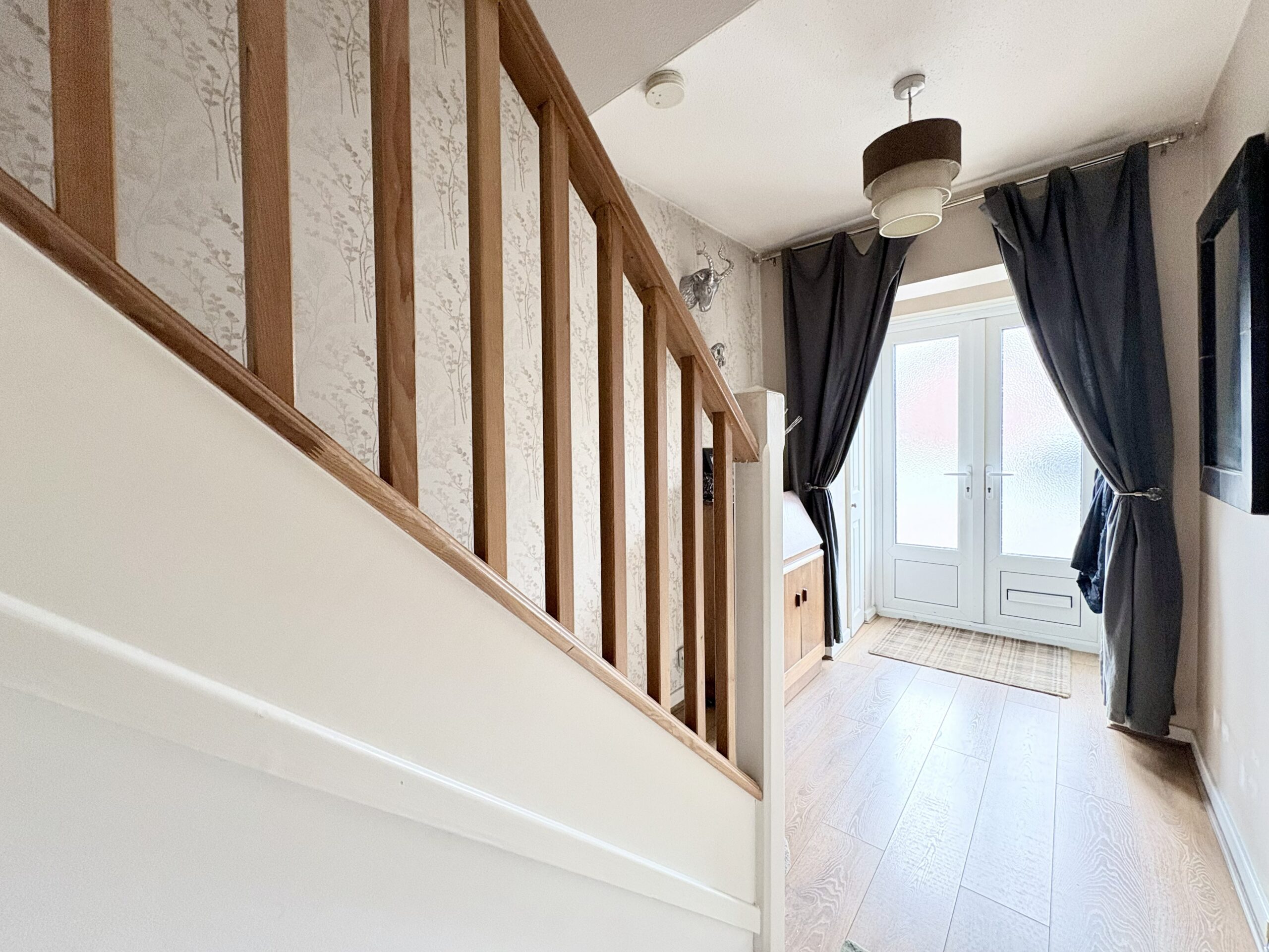 Entrance Hall - A welcoming entrance space with two front-facing frosted double glazed doors allowing plenty of natural light. The hallway benefits from a useful cloak/storage area, wood effect laminate flooring, central heating radiator and single pendant light fitting. Stairs rise to the first floor.