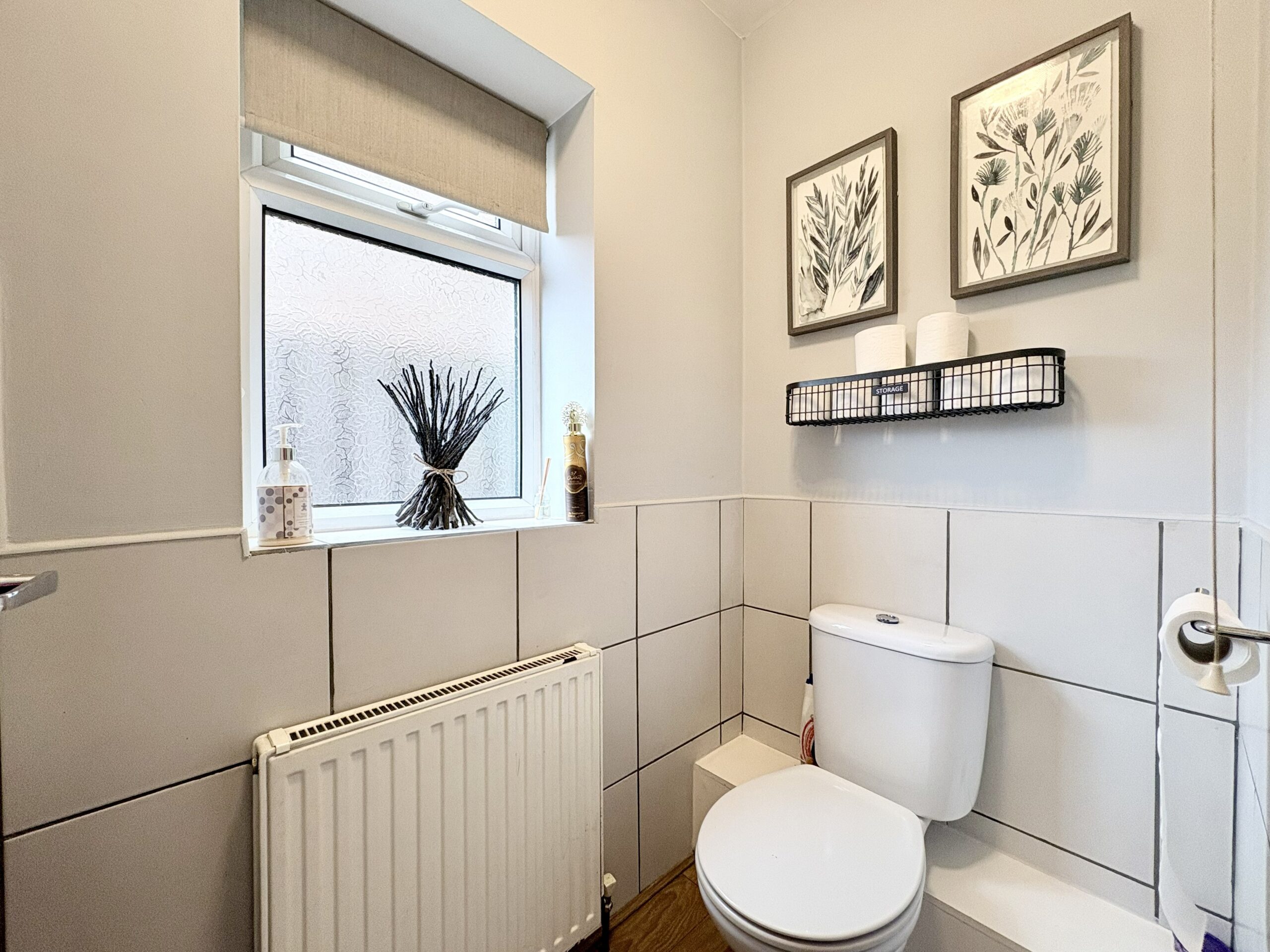 Ground Floor W.C - Fitted with WC and wash hand basin with mixer tap. There is partial tiling, side-facing obscure double glazed window, central heating radiator, wood effect laminate floor and single pendant light fitting.