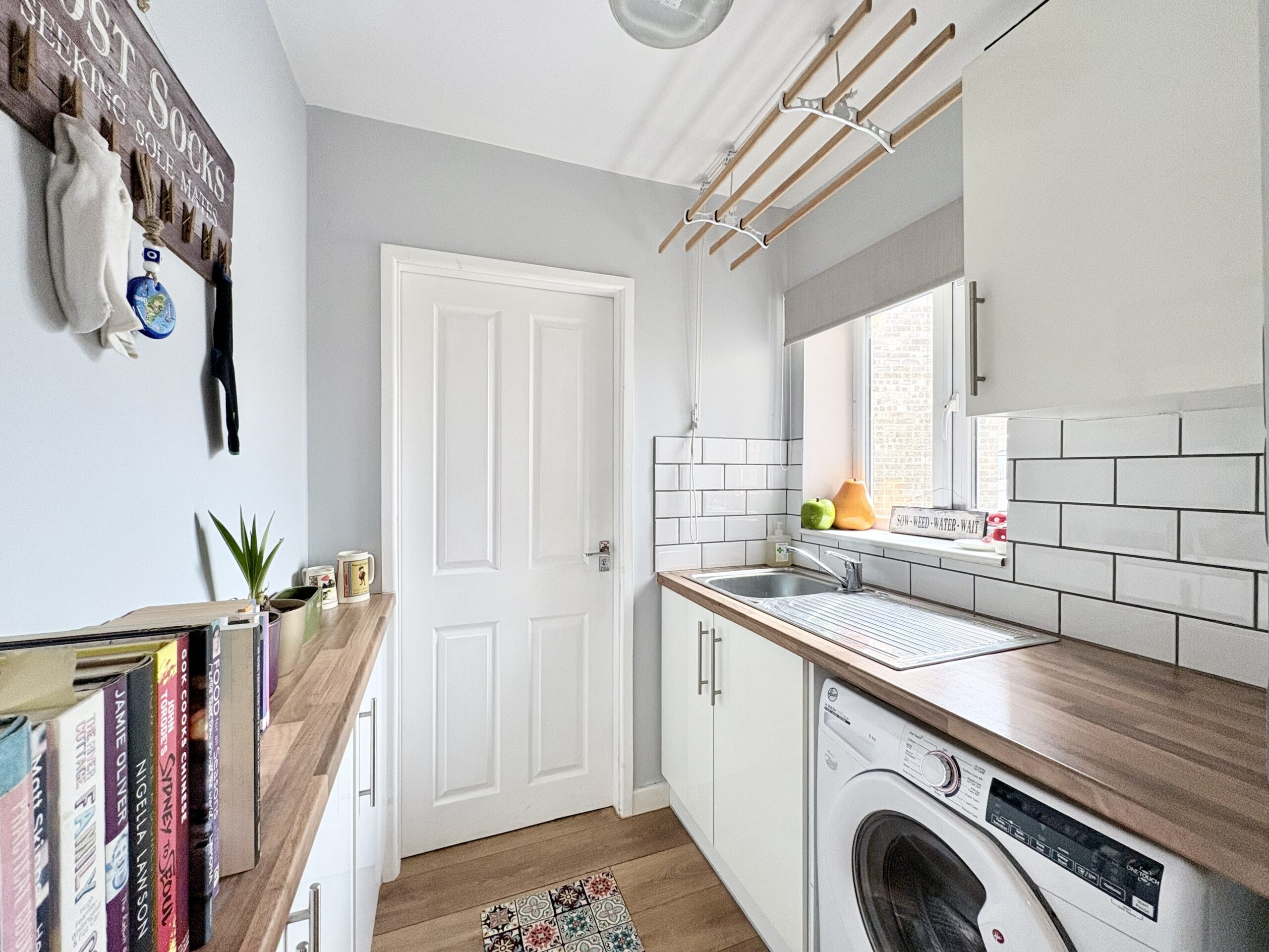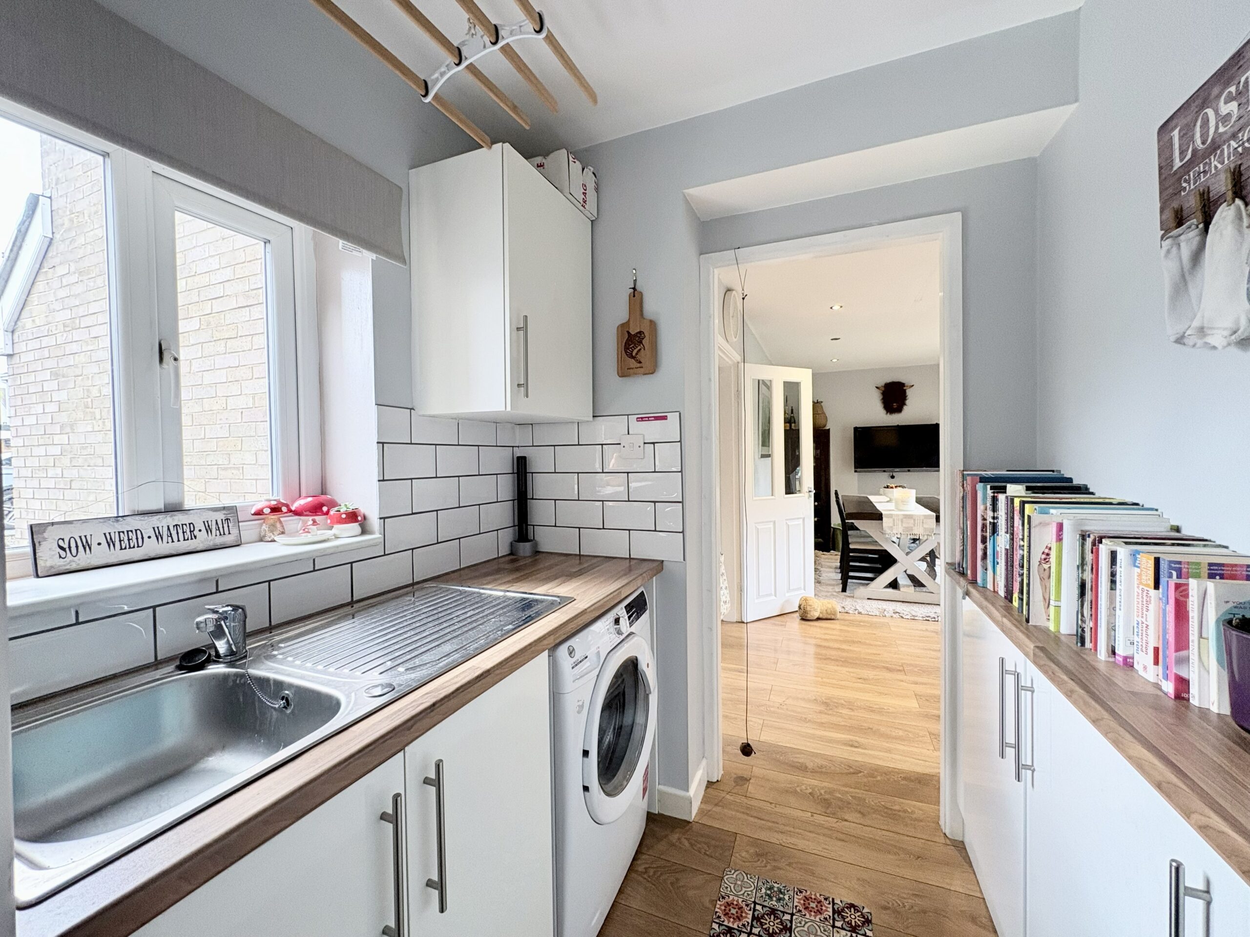 Utility Room - With front-facing double glazed window, wall and base units, coordinating work surfaces matching the kitchen, stainless steel sink and drainer, plumbing for washing machine and space for appliances. Wood effect laminate flooring, central heating radiator and single pendant light fitting.
