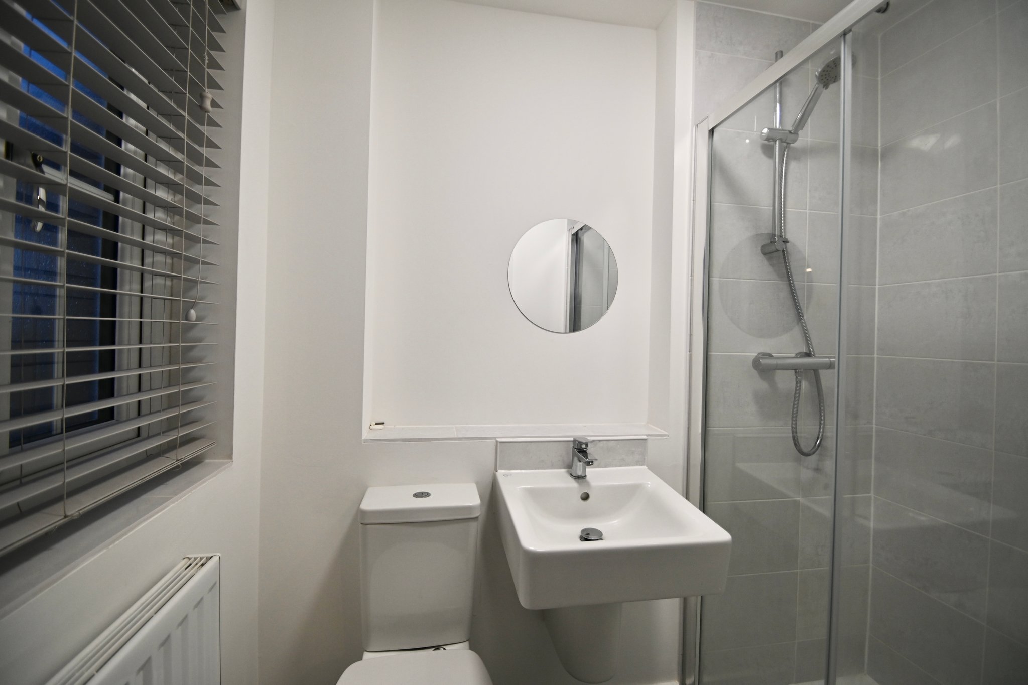 En-Suite Shower Room - Fitted with a walk-in shower enclosure, wash hand basin, and low-level WC, finished with vinyl floor covering, radiator, and ceiling light fitting.