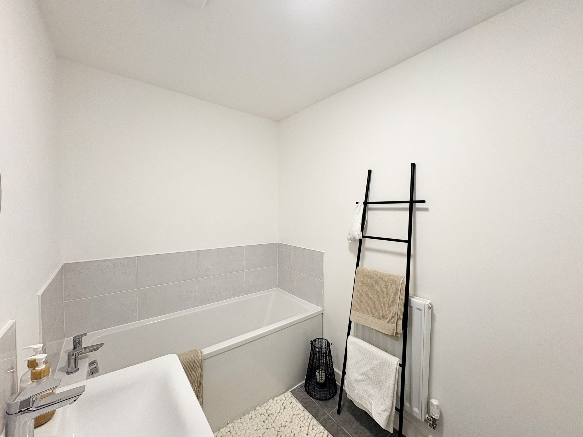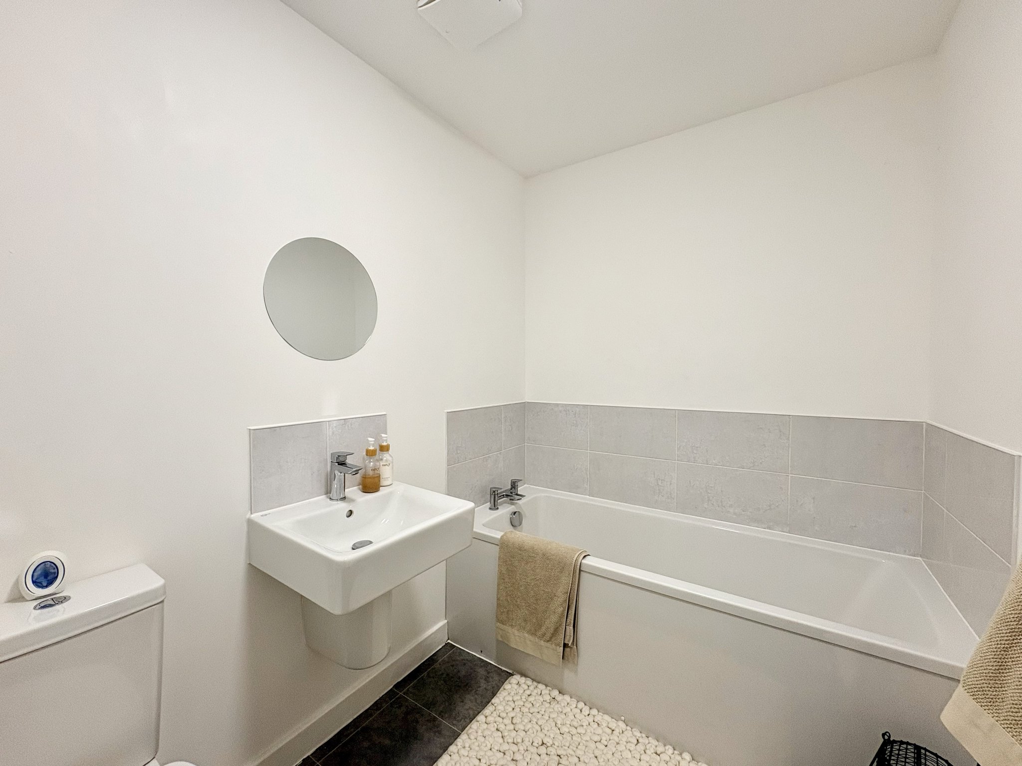 Family Bathroom - The family bathroom is fitted with a bath with mixer taps, wash hand basin, and low-level WC, finished with vinyl floor covering, radiator, and ceiling light fitting.