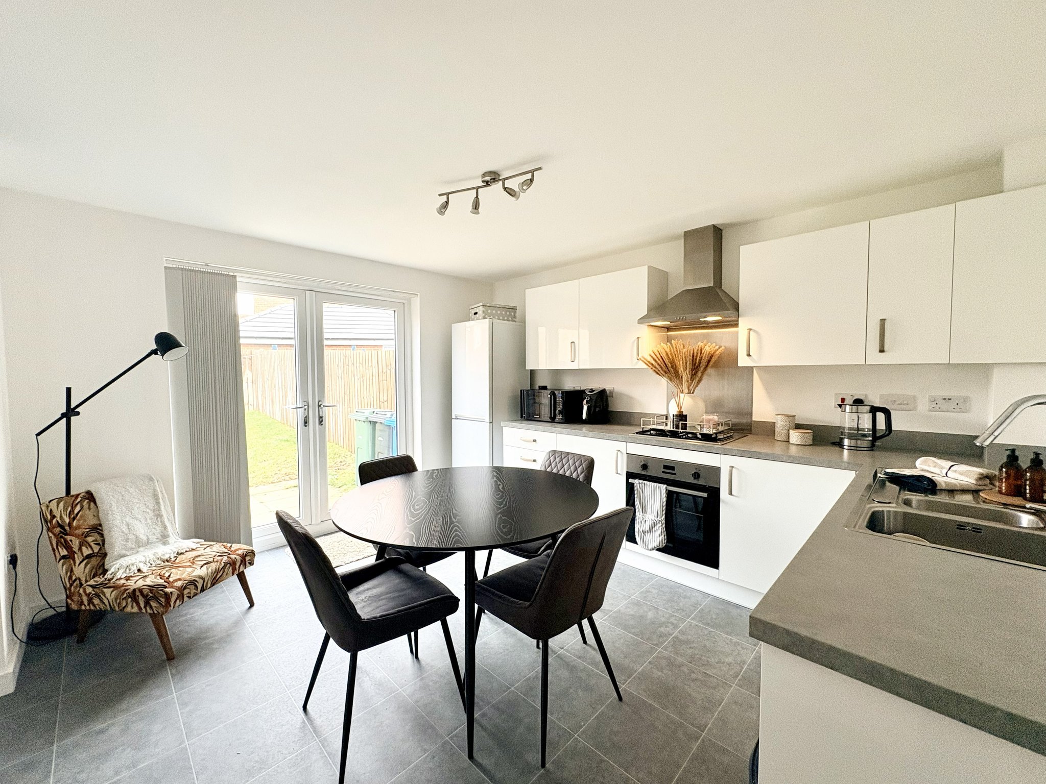 Kitchen / Diner - A modern open-plan kitchen/diner fitted with a range of floor and wall units with contrasting worktops. Appliances include an integrated oven, gas hob with extractor hood, and there is space for a fridge and dishwasher. Finished with vinyl floor covering, radiator, and single pendant light fitting, with French doors opening into the rear garden. There is plenty of space for a dining table.