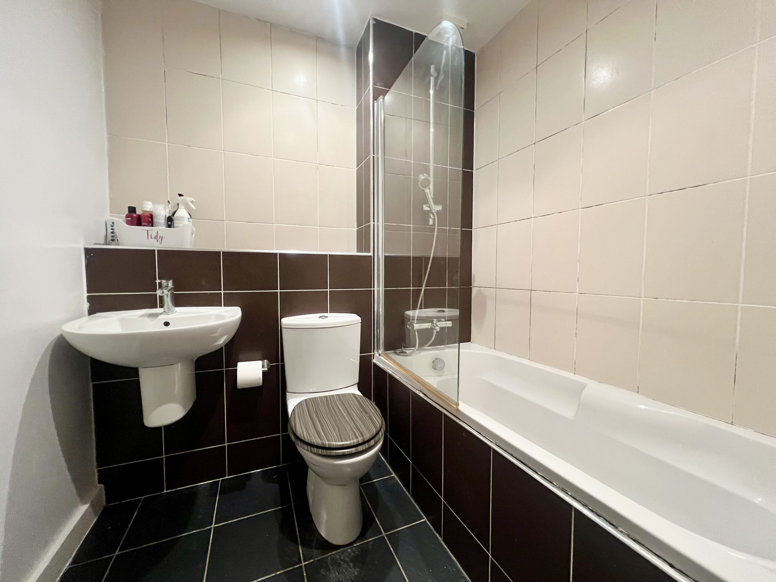 The main bathroom is fully tiled and includes spot lighting, a bath with shower over, WC, hand basin, tiled flooring, and a heated towel rail.
