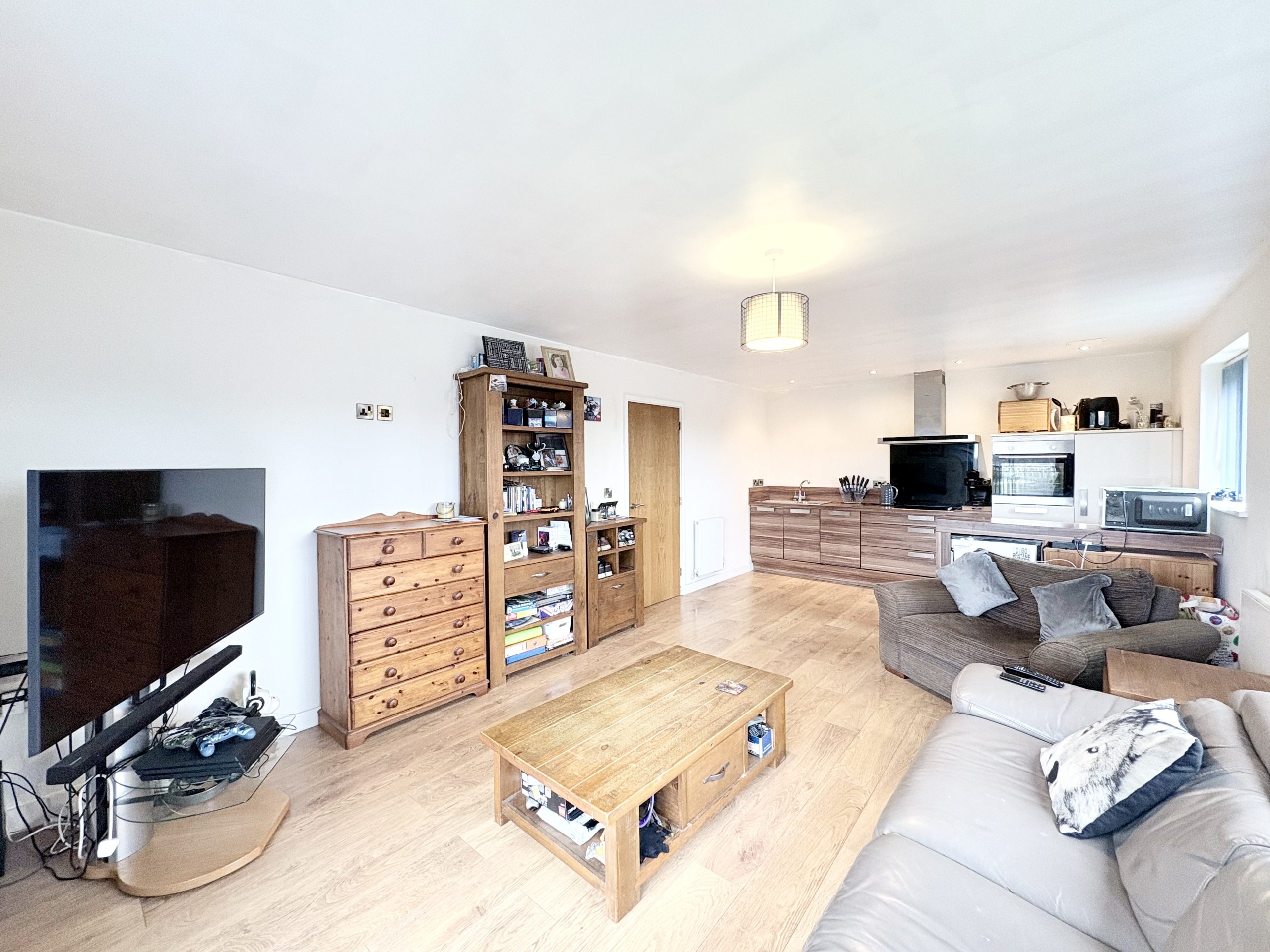 The open-plan kitchen is fully fitted with a range of floor and wall units, a breakfast bar, and integrated appliances including an oven, hob, extractor hood, and dishwasher. The kitchen also benefits from spot lighting and a side-aspect window. The lounge features two sets of sliding doors with Juliet balconies, offering open-aspect views. The room continues the wood-effect flooring and includes two radiators and two single pendant light fittings.
