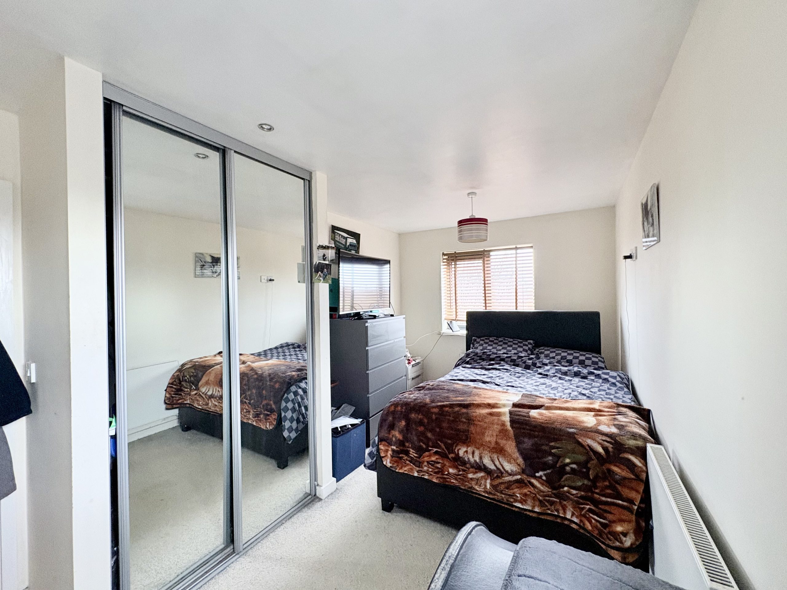 The second double bedroom also benefits from mirrored fitted wardrobes, carpeted flooring, and a rear-aspect window.
