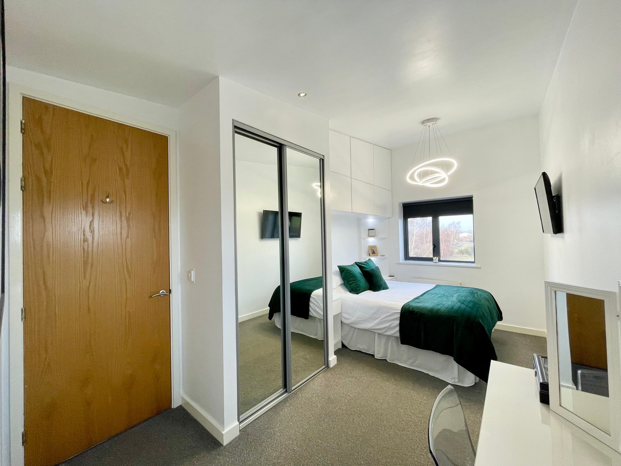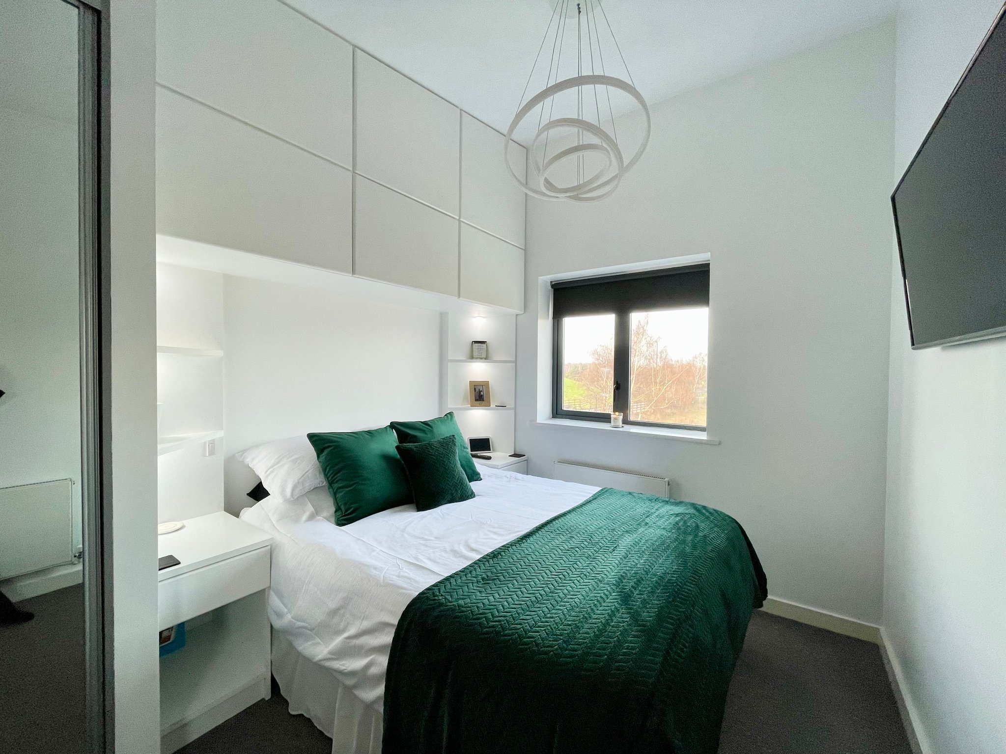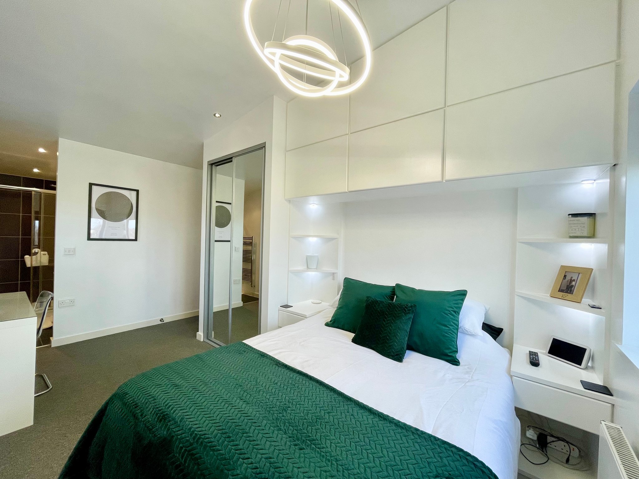 The lounge has 2 sets of sliding doors with Juliet balcony and open aspect view. There is a bespoke media wall with cabinets which finish this room perfectly.