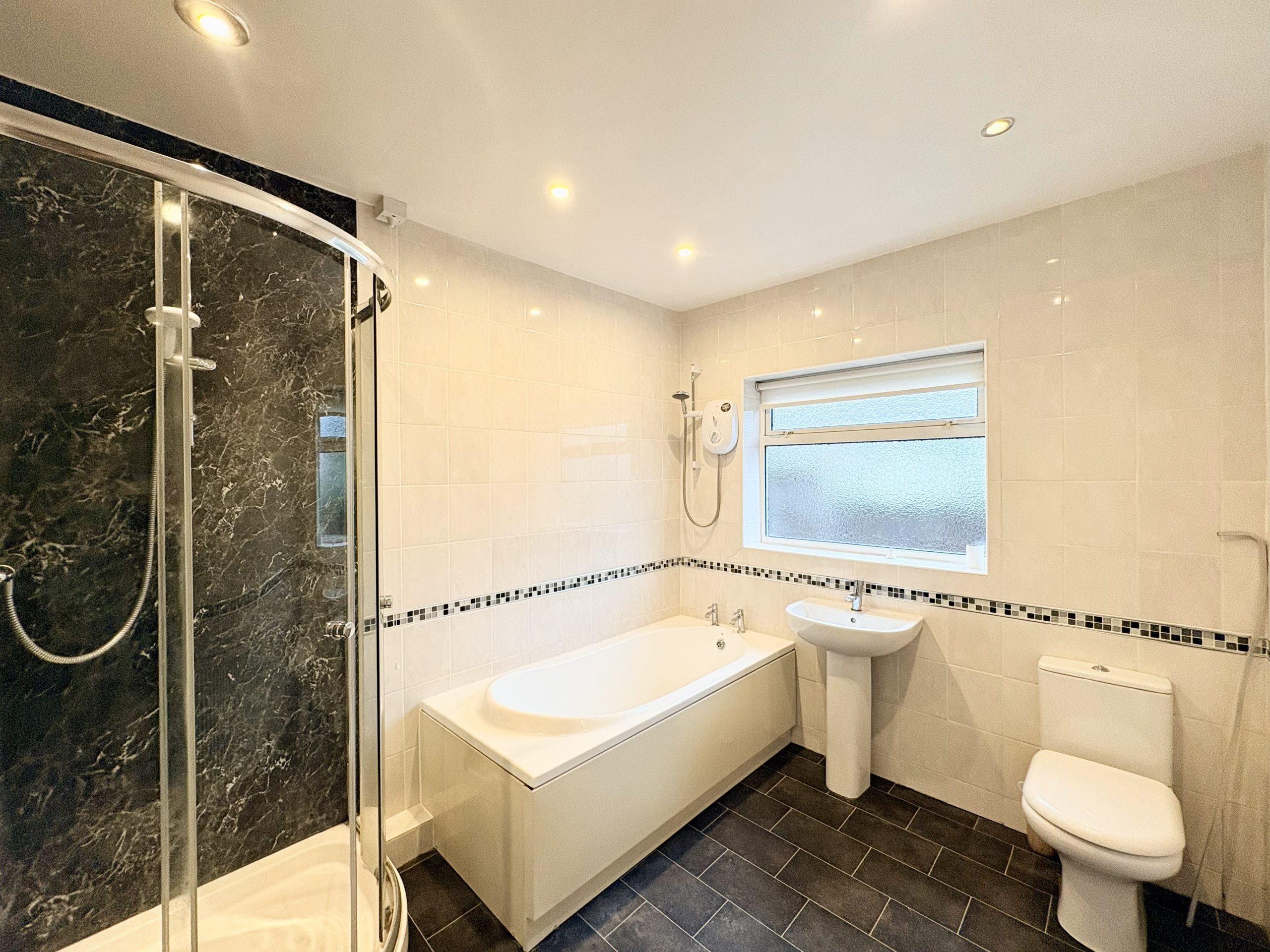 Bedroom One is a well-proportioned double bedroom positioned to the front of the property with radiator and single pendant light fitting. Bedroom Two is a rear-facing double bedroom overlooking the garden, providing a peaceful and comfortable space with radiator and single pendant light fitting. Bedroom Three is a small double bedroom with a front aspect window, ideal for use as a guest bedroom, home office or hobby room, and also provides access to the loft. The family bathroom is fully tiled and fitted with a modern suite comprising a bath and separate walk-in shower, hand basin and WC. The room benefits from a side aspect window, vinyl flooring, spot lighting and a radiator.