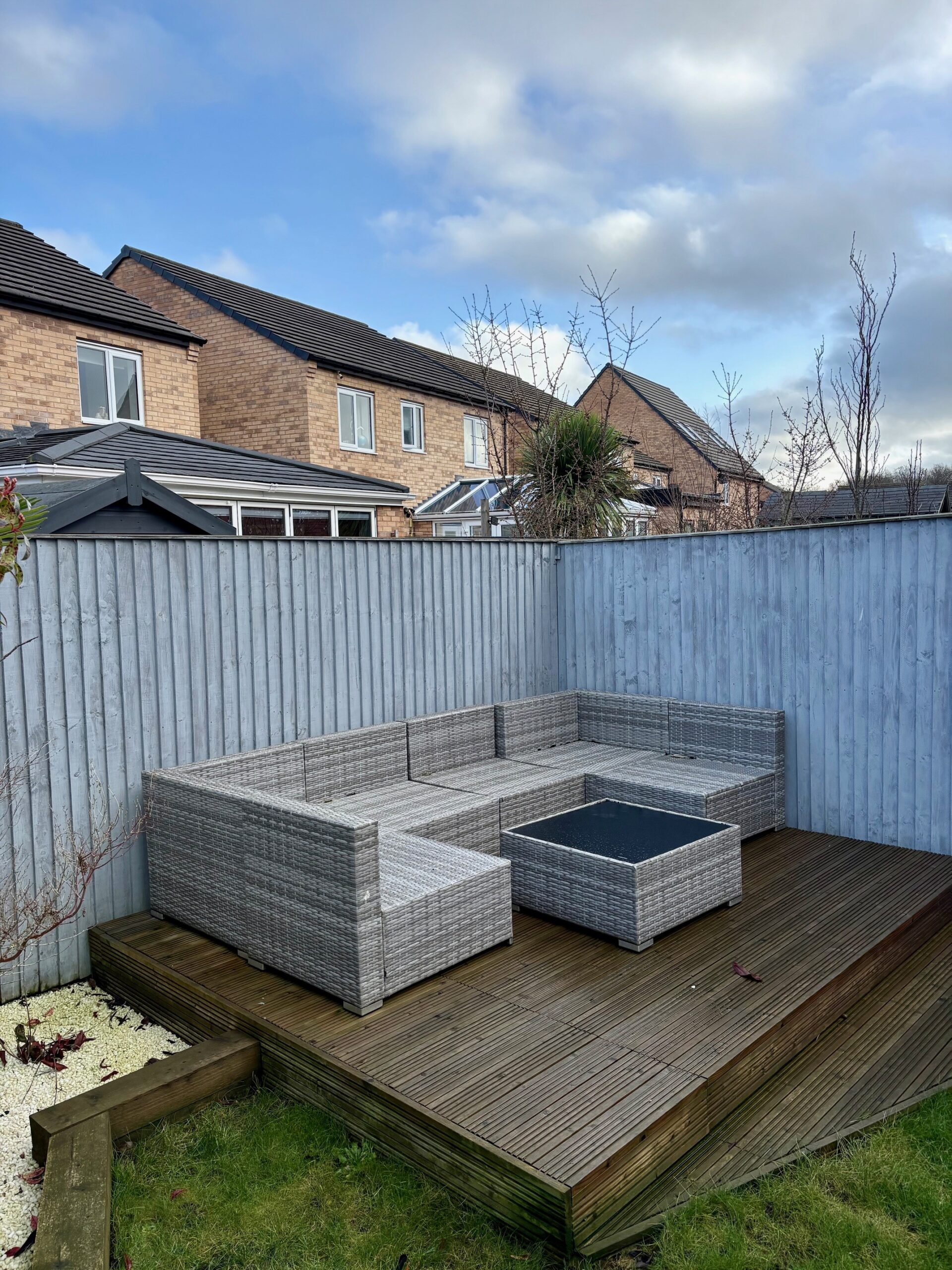 To the front of the property, there are two allocated parking spaces, along with convenient access to the front entrance and a side gate leading to the rear garden. The rear garden is beautifully maintained, predominantly laid to lawn with a decking area at the far end, providing a low-maintenance and private outdoor space. A patio area offers the perfect spot for socialising and entertaining, making this garden both functional and inviting.