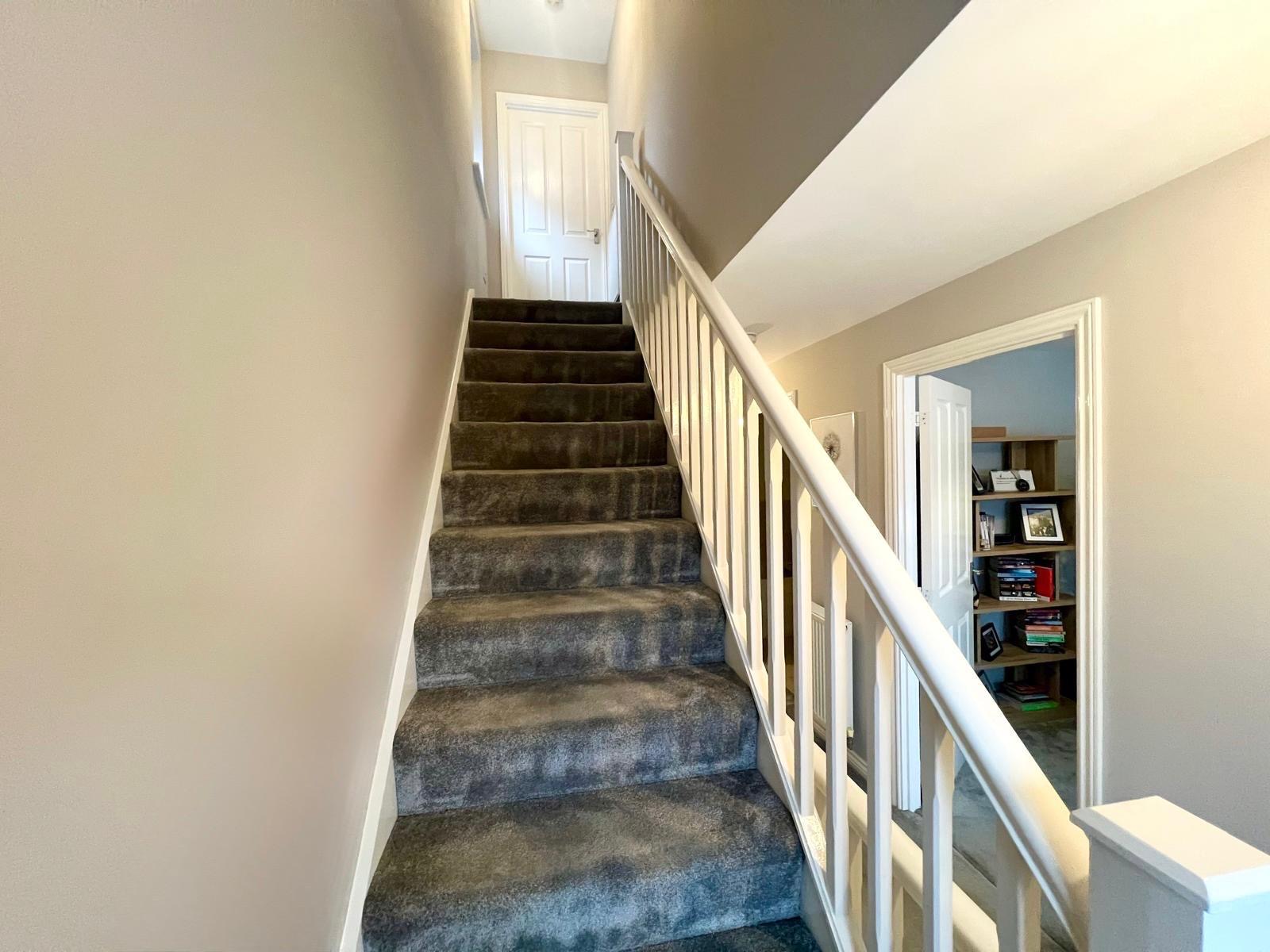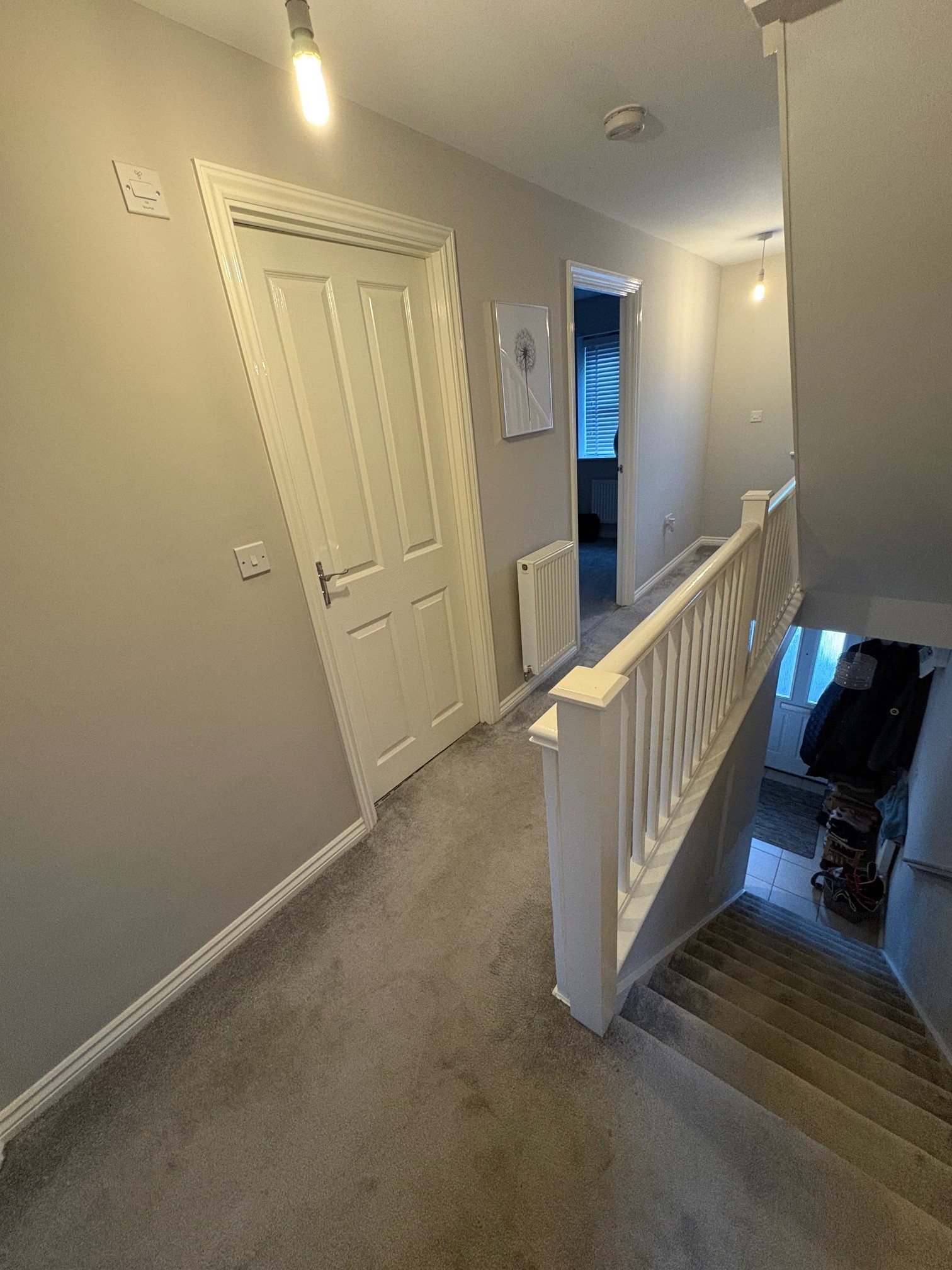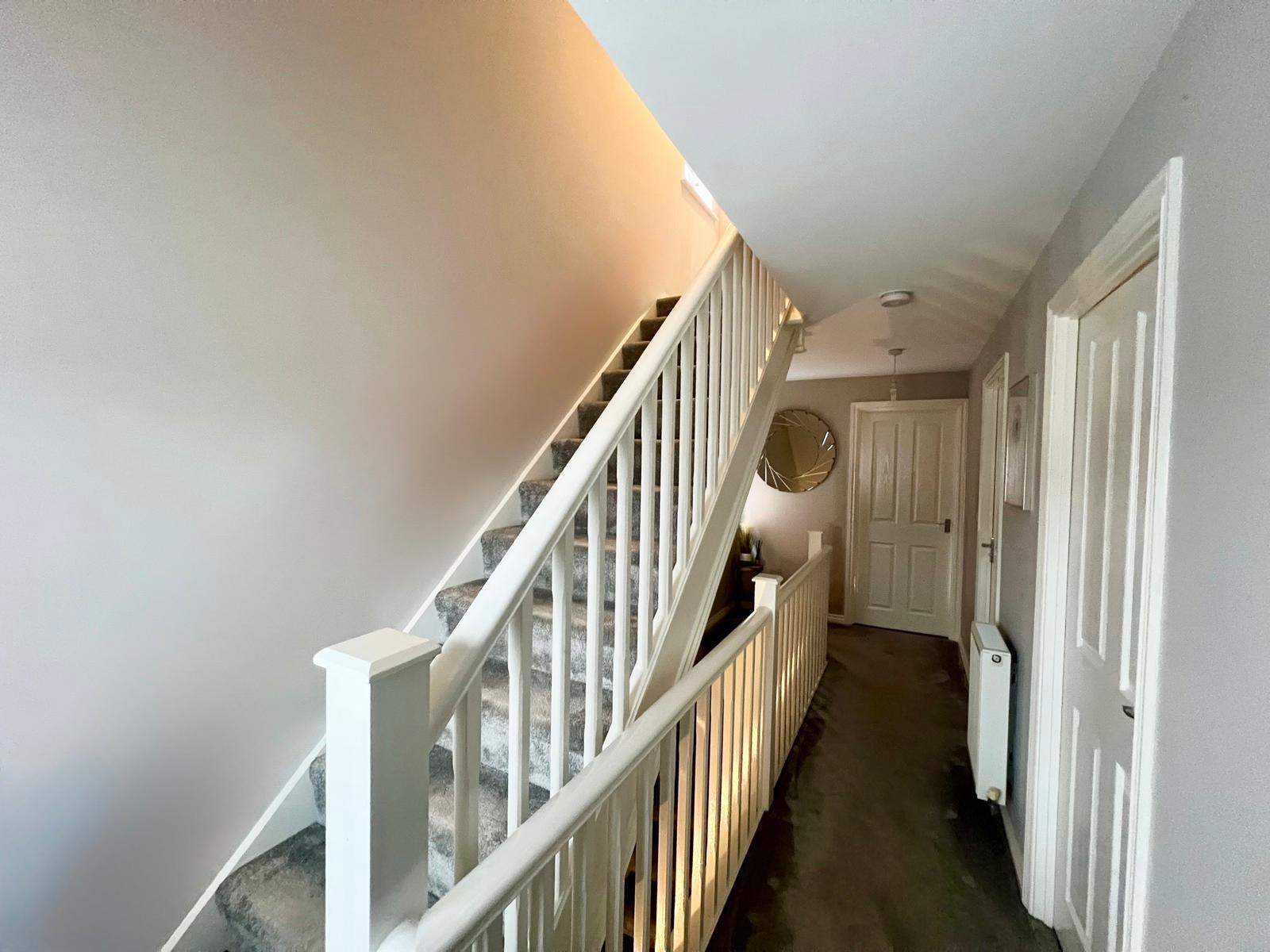 The spacious and inviting landing is flooded with natural light from two windows, creating a bright and airy feel, and is complemented by carpeted flooring, two stylish pendant light fittings, and two radiators, providing a comfortable and welcoming transition to the upper floors.