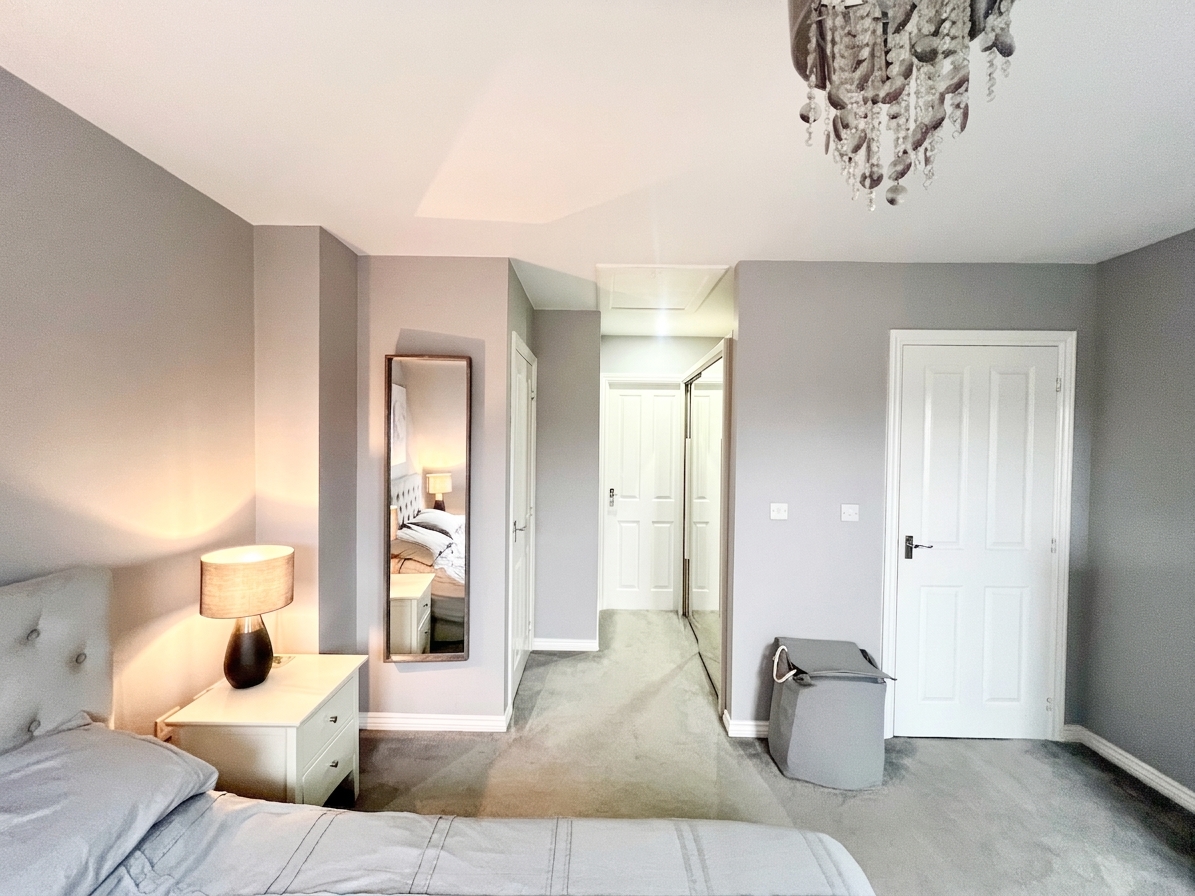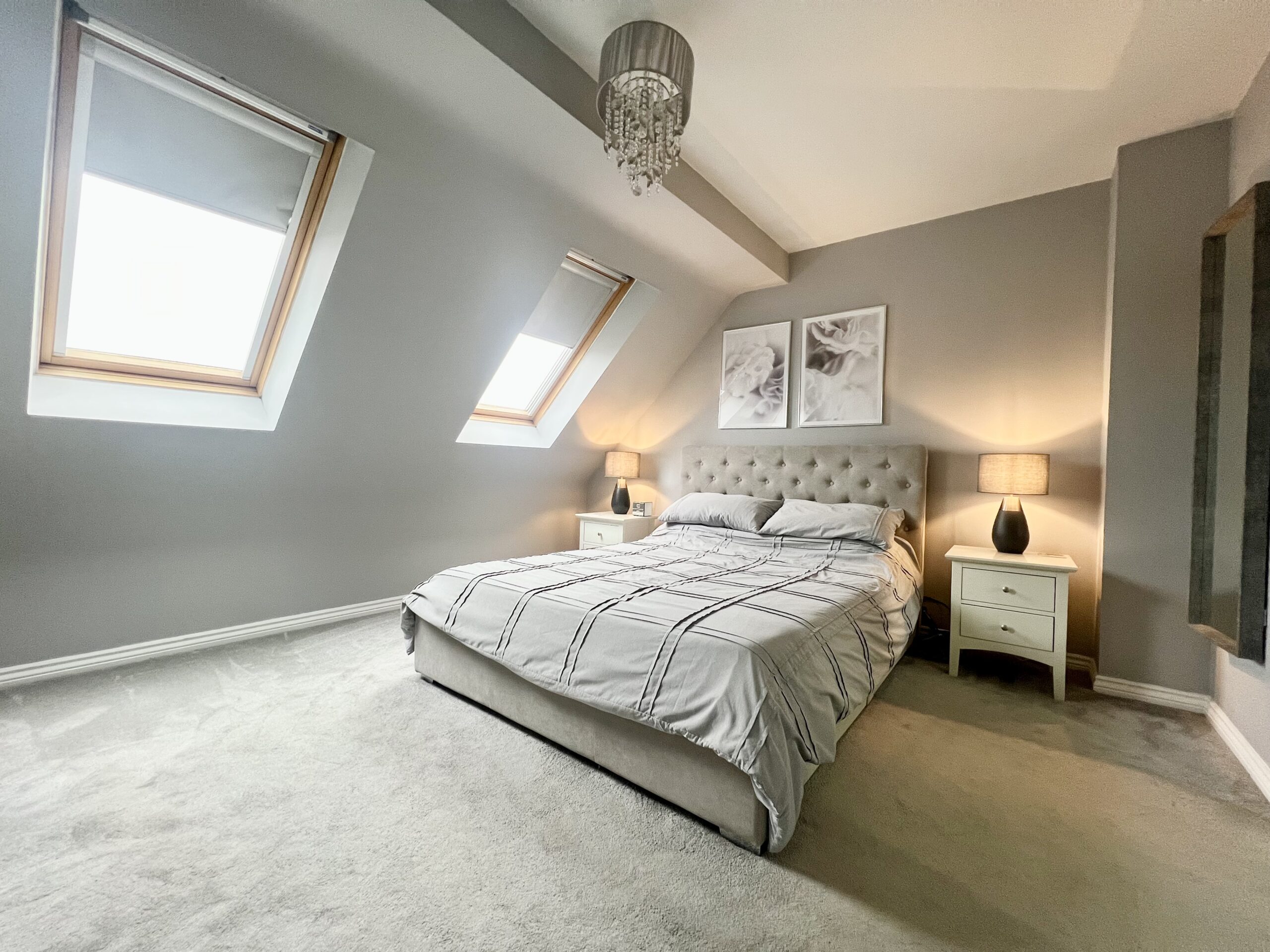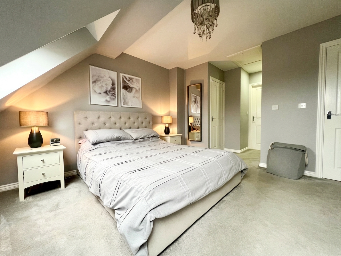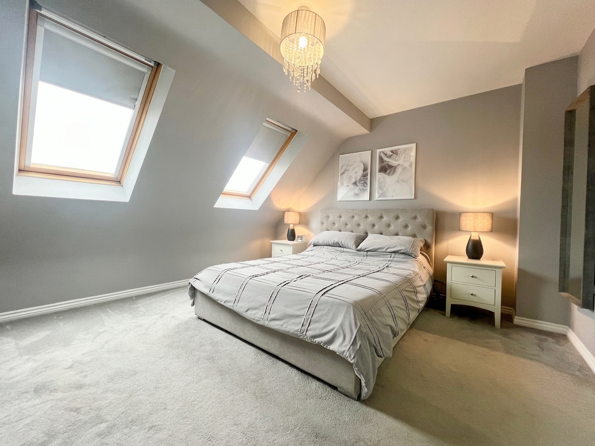 The spacious principal bedroom, located on the top floor, is a serene retreat featuring two roof windows that fill the room with natural light, carpeted flooring, and direct access to both the ensuite bathroom and a wardrobe area. This peaceful and private space offers a relaxing haven away from the rest of the house.