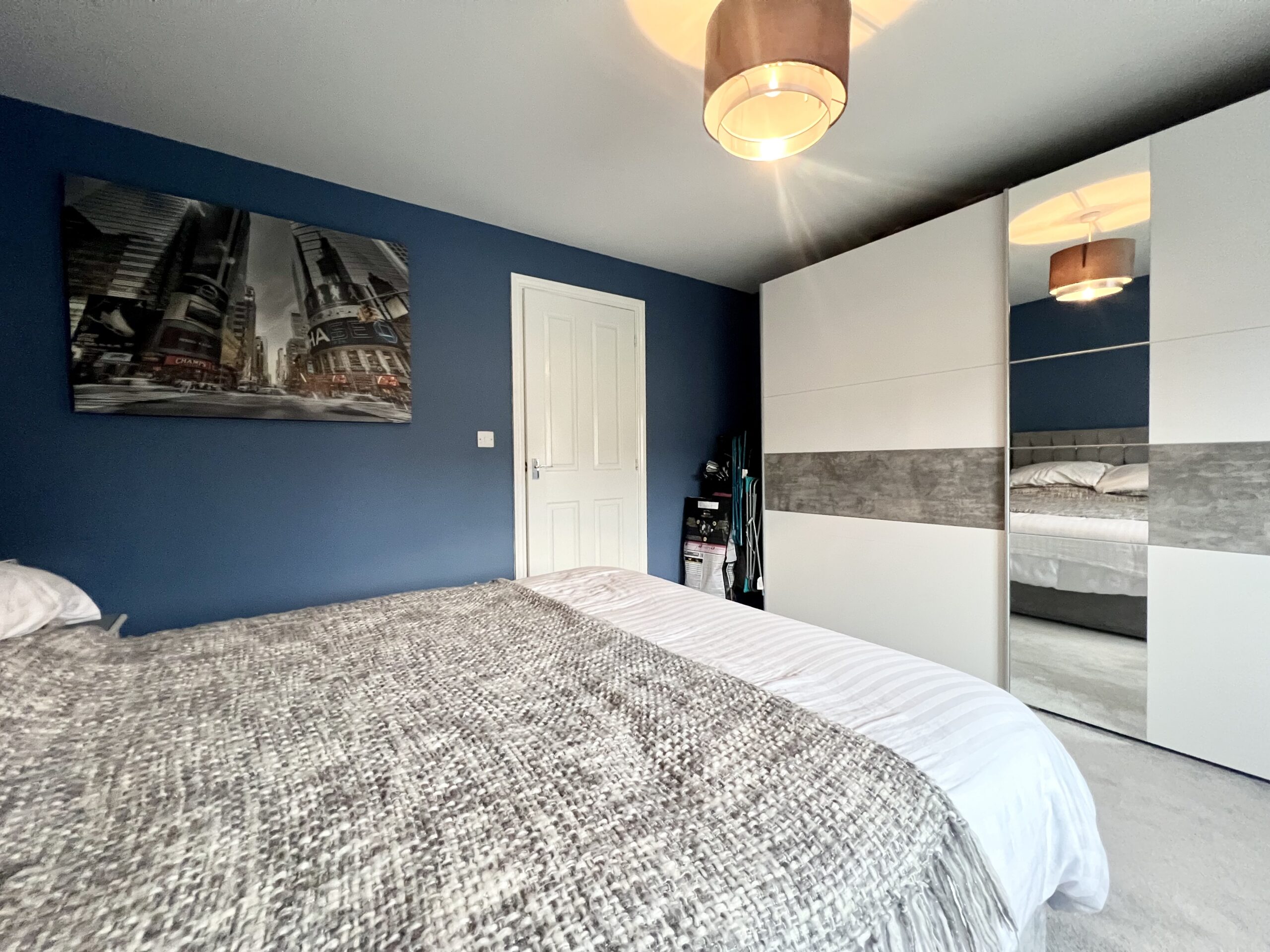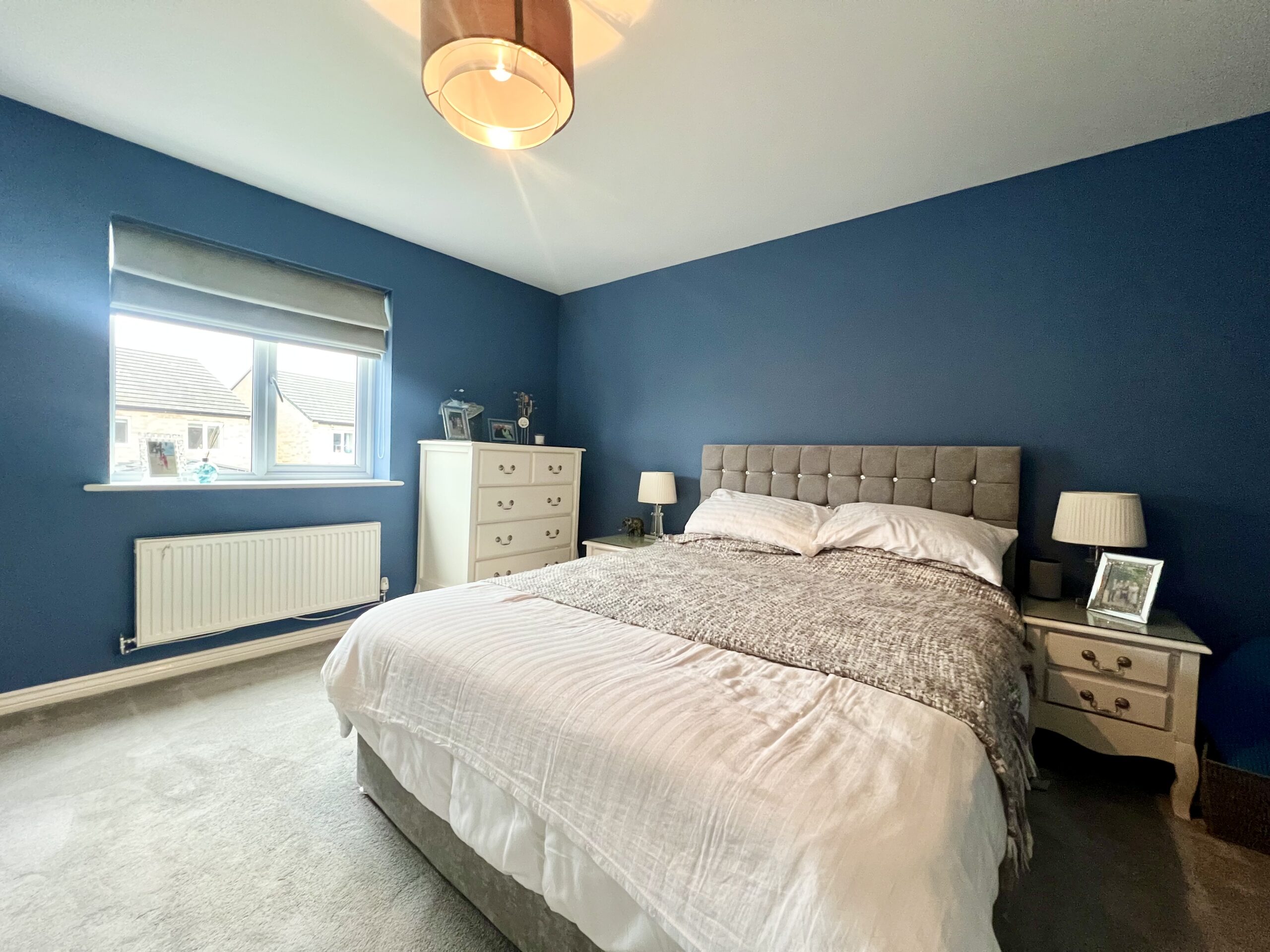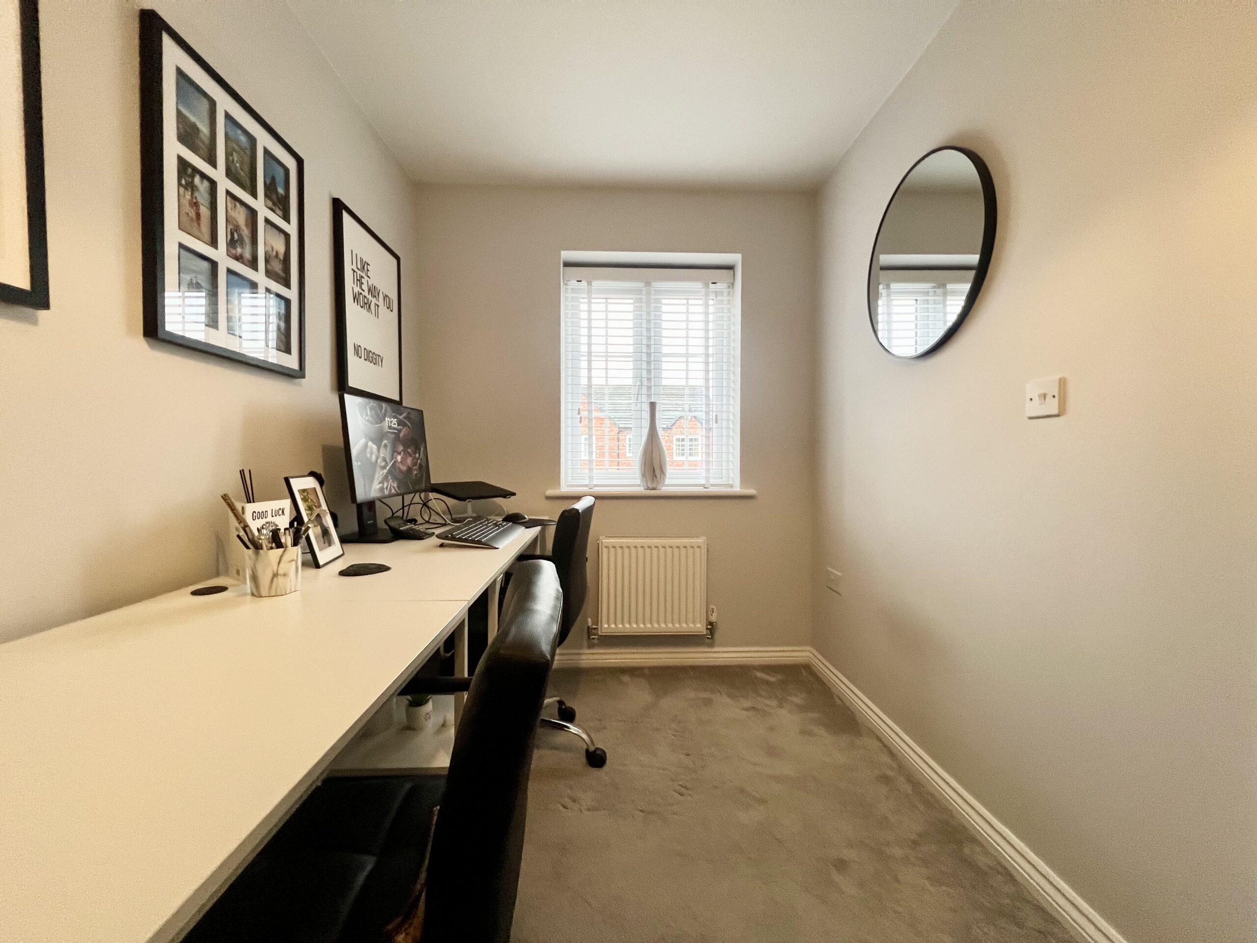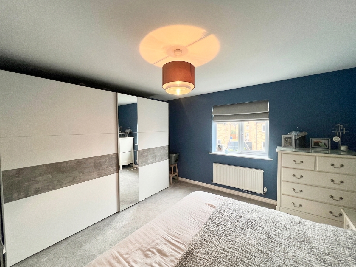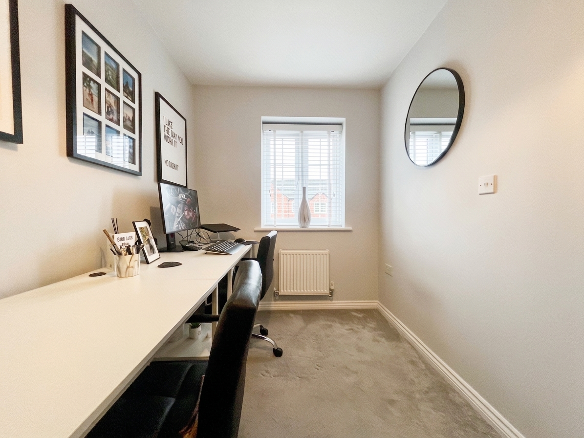The third bedroom, located at the front of the property, is currently arranged as a home office but offers flexible use as a bedroom, study, or hobby space. With carpeted flooring, a radiator, and a stylish pendant light, it is a bright, comfortable, and adaptable room to suit a variety of lifestyle needs.