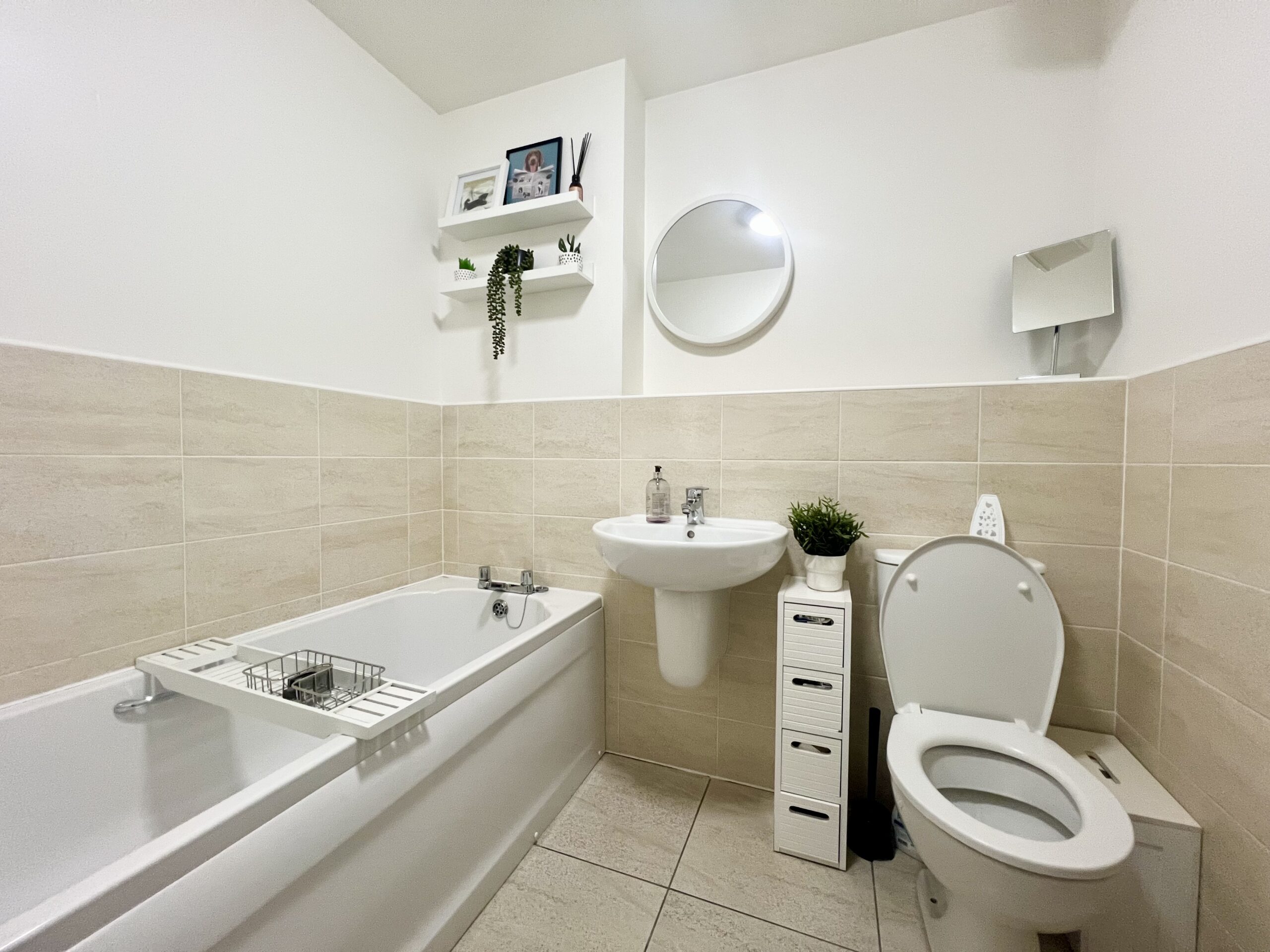 The family bathroom, conveniently located on this floor, offers a stylish and modern finish with tiled flooring and half-tiled walls, and is fitted with a bath, WC, sink, and radiator, creating a bright and inviting space perfect for relaxing and unwinding.