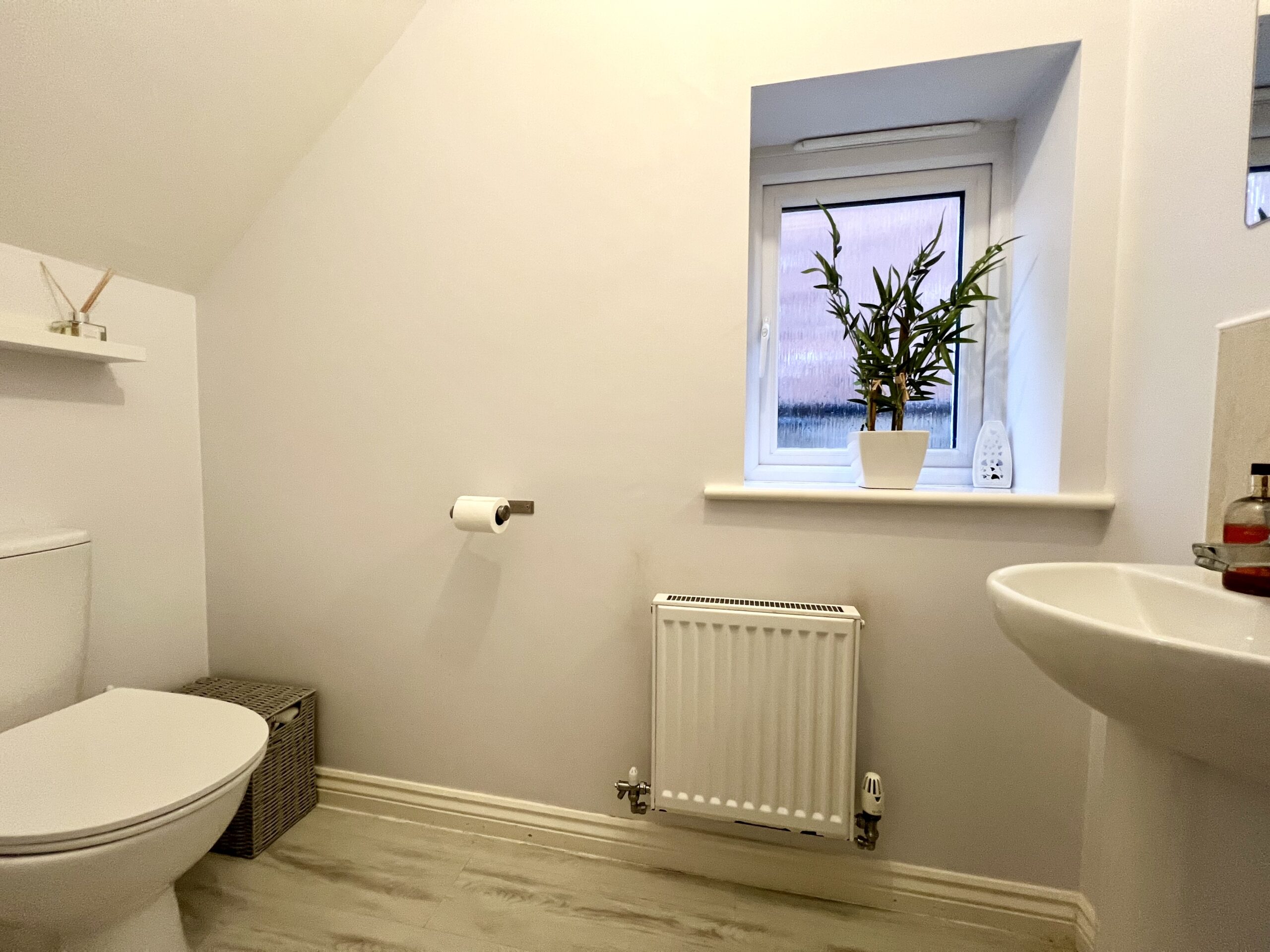 There is a convenient ground floor WC featuring an obscure side window for privacy, along with a radiator, WC, and hand basin.