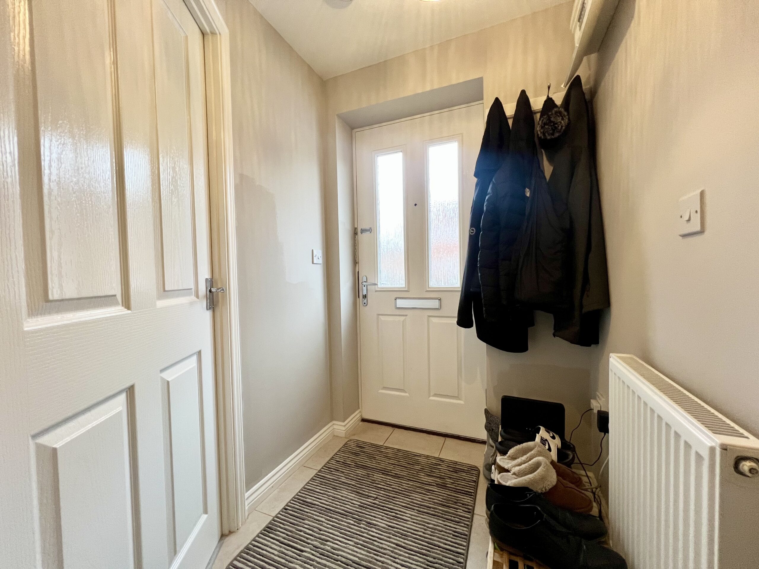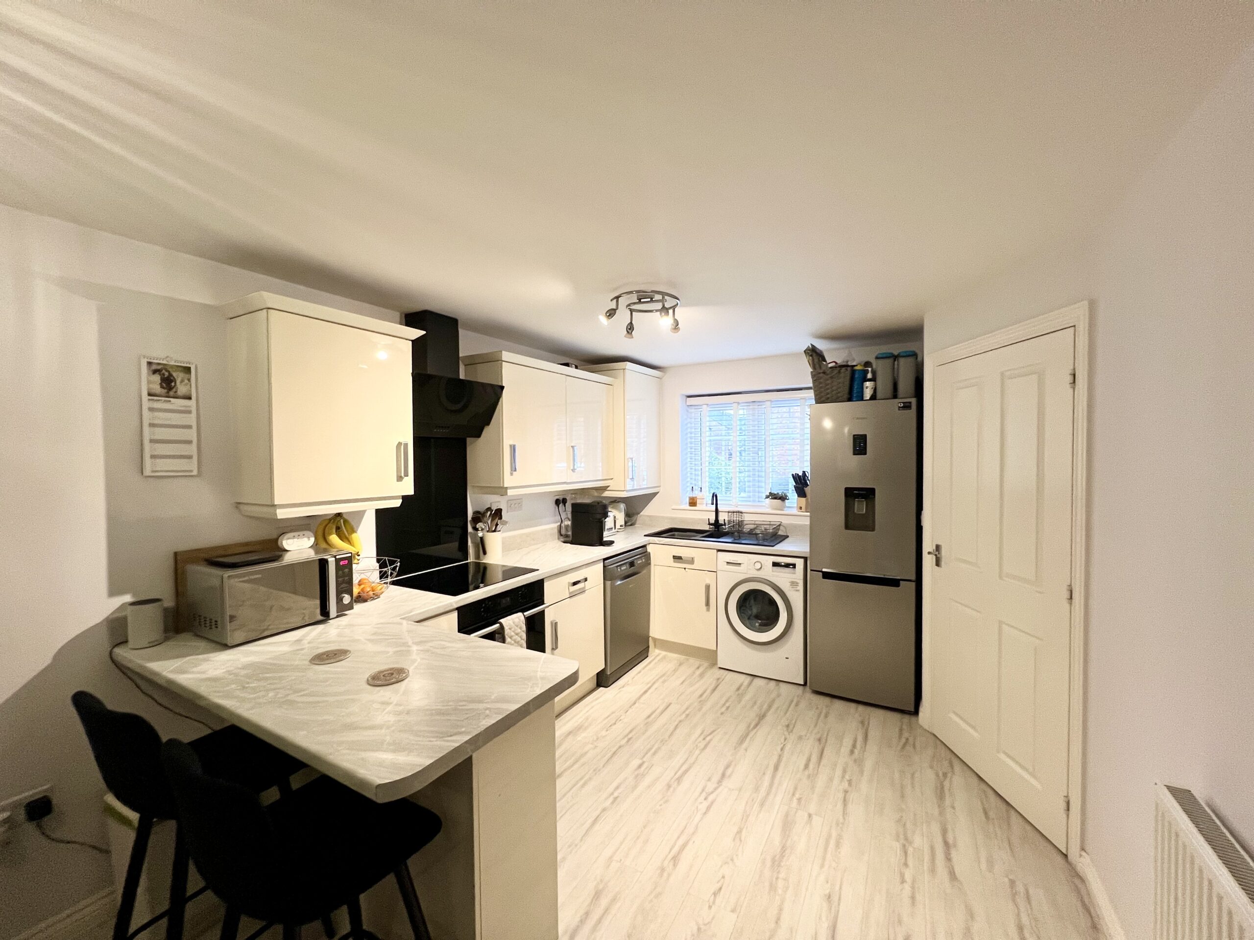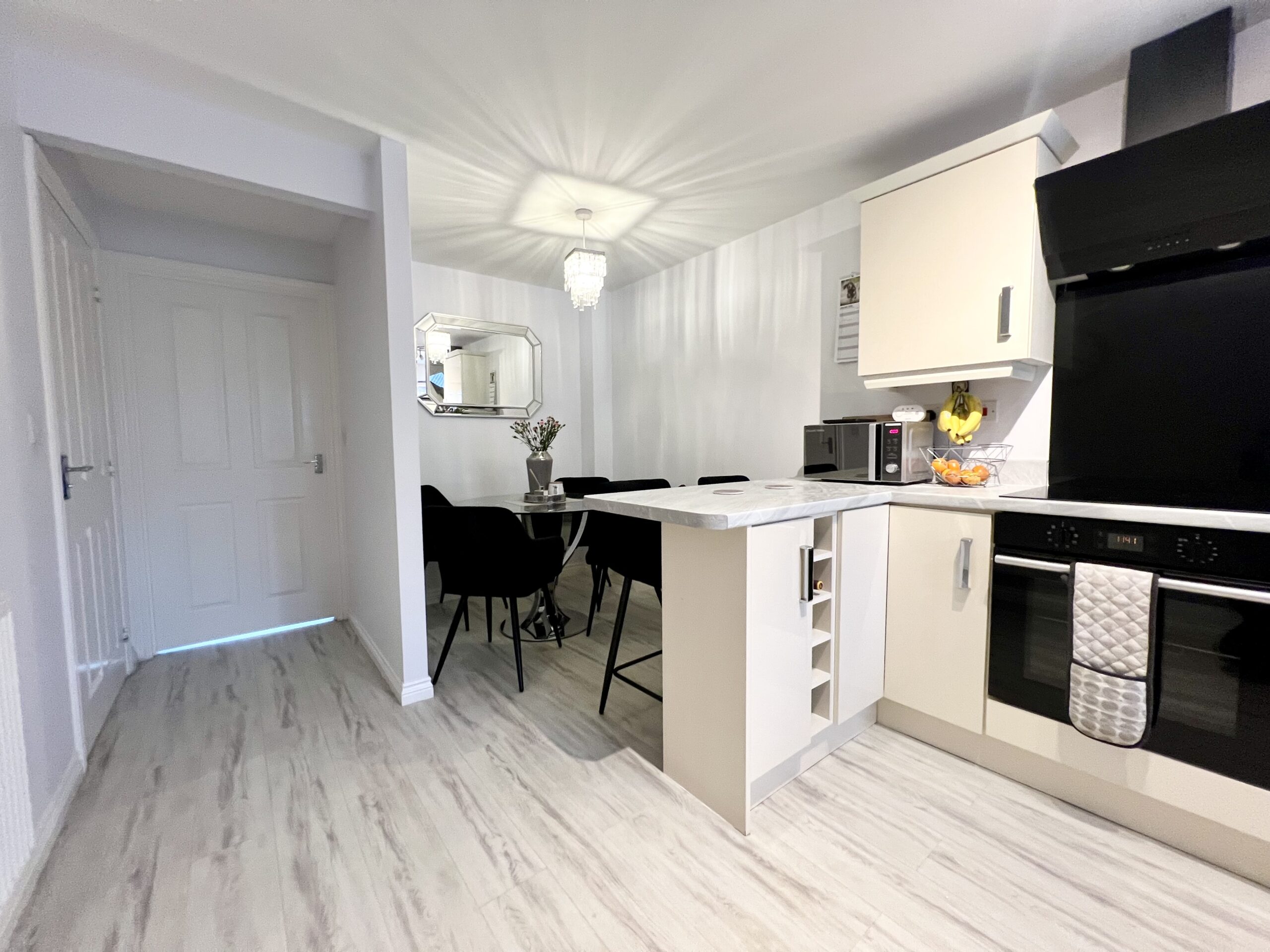 On entering the property, you are welcomed into a spacious hallway with wood-effect flooring and a single pendant light fitting, creating a warm and inviting first impression, with access to the staircase leading to the first floor and the modern kitchen/diner.