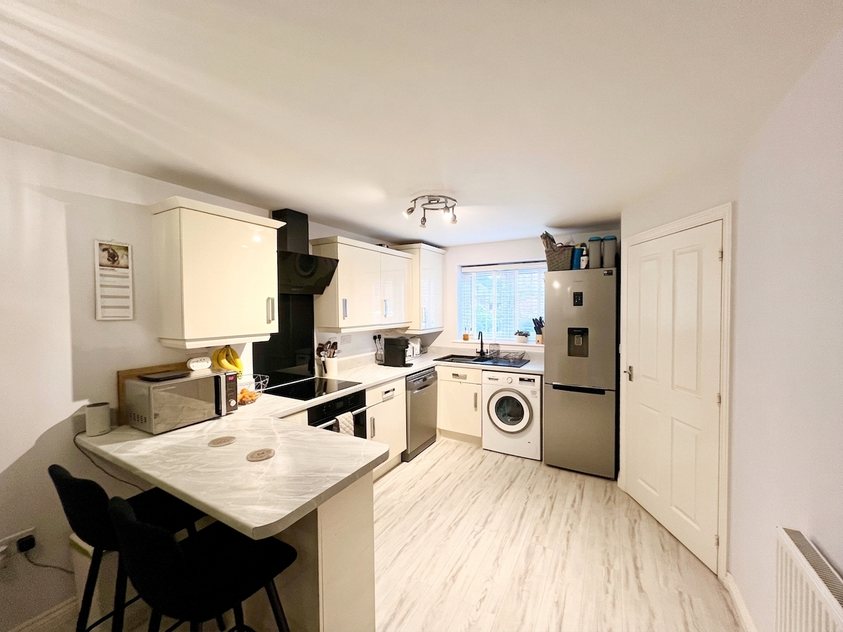 The kitchen/diner, with floor and wall cupboards recently installed, features an electric hob and oven, with wood-effect flooring flowing throughout the ground floor, a front-facing window, two single pendant light fittings and under-cupboard lighting to create different moods; the space also benefits from a breakfast bar with seating alongside a separate dining area, offering excellent versatility for family living, and is completed by a radiator.