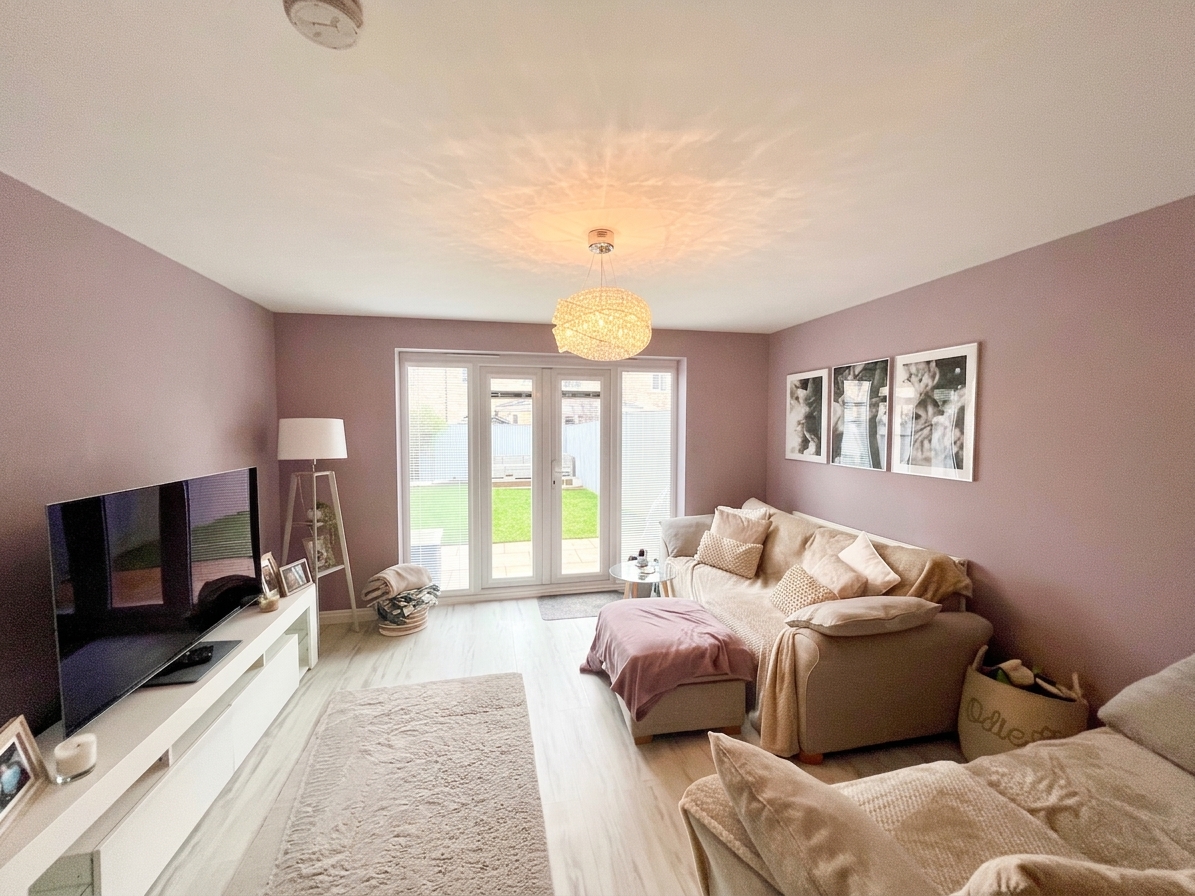 The separate lounge, located to the rear of the property, benefits from patio doors opening onto the rear garden, wood-effect flooring, a radiator, and a single pendant light fitting, creating an ideal space for relaxing while enjoying views over the garden.
