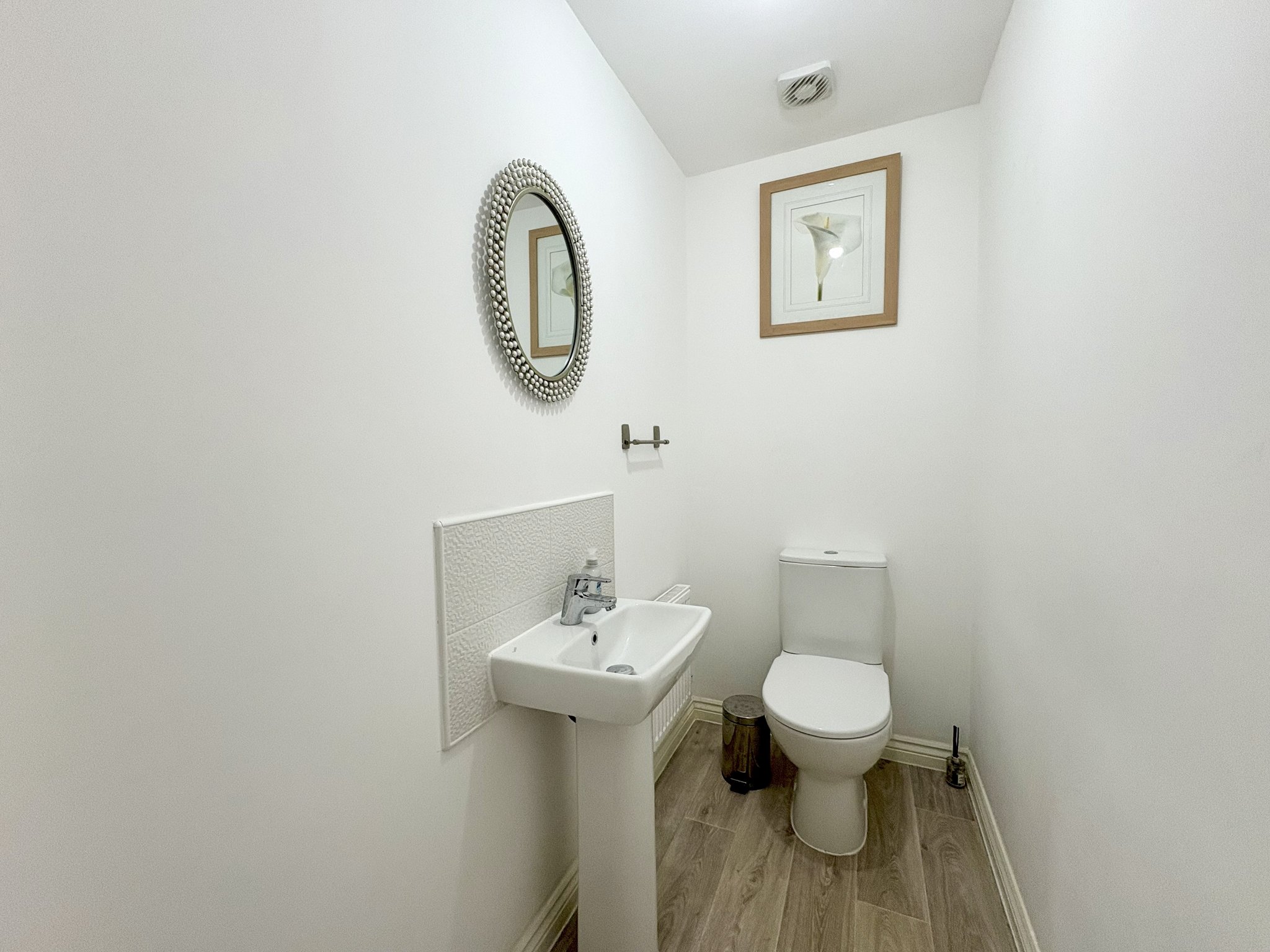 Ground Floor WC Comprising WC and hand basin, with part-tiled walls, vinyl flooring, extractor fan, radiator, and spot lighting.