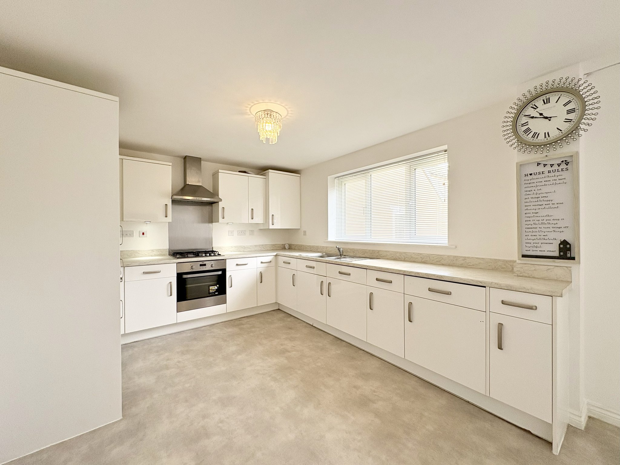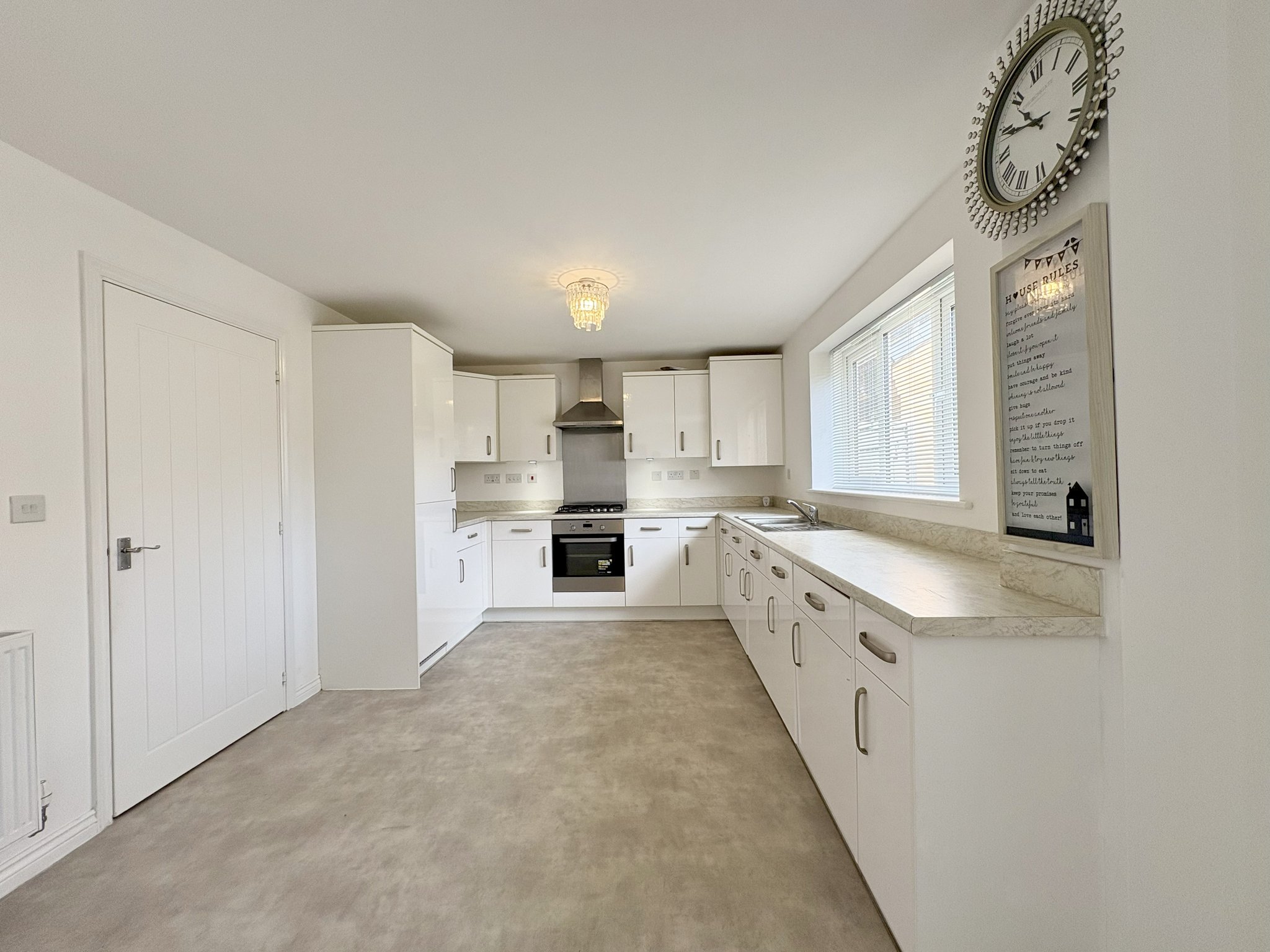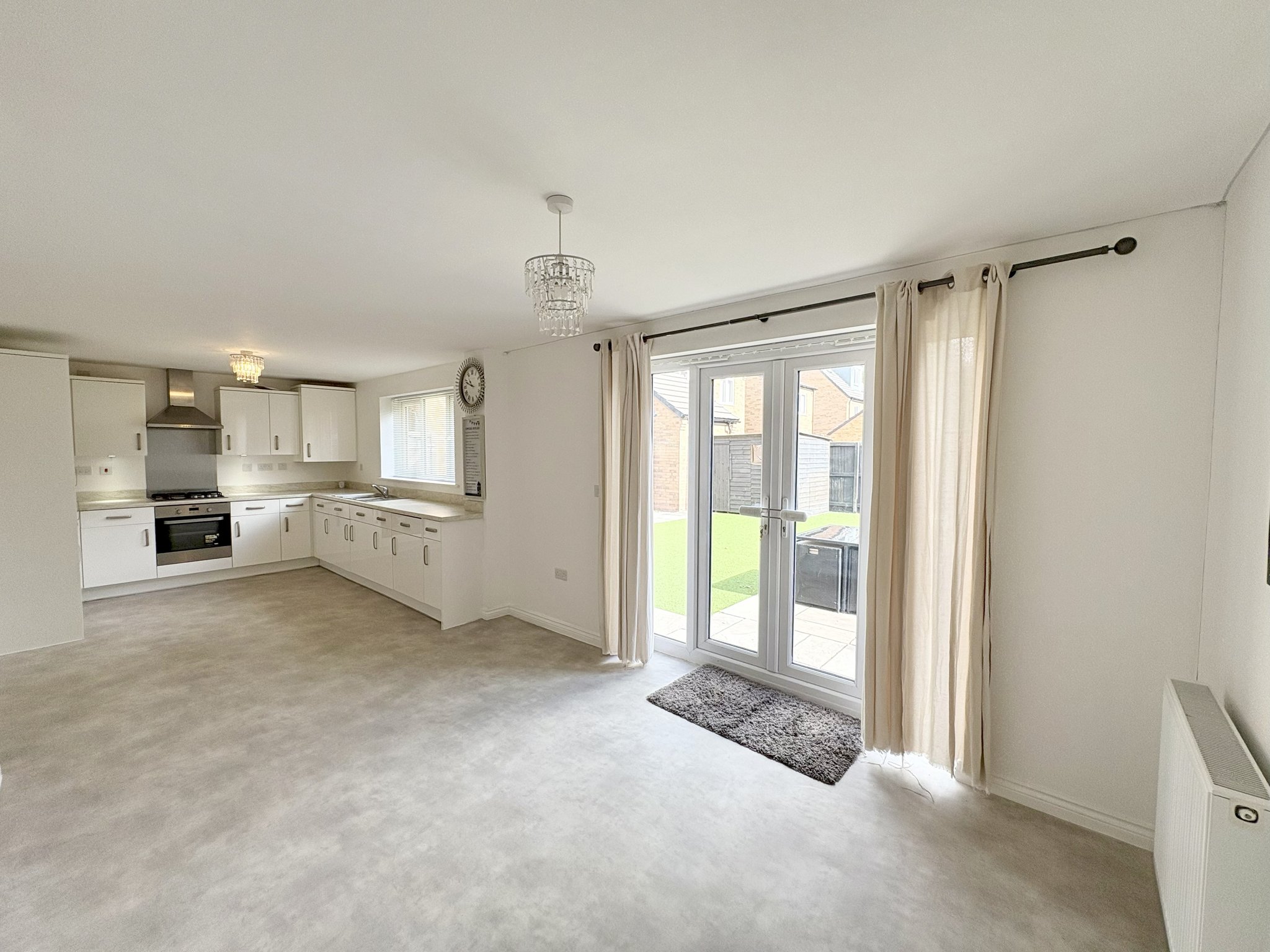 Kitchen/Dining Room This light-filled and spacious open-plan kitchen and dining area sits to the rear of the home, with French doors opening directly onto the patio and garden. The kitchen is fitted with a range of modern wall and base units, stylish worktops, and integrated appliances including oven, hob with extractor, fridge, freezer, dishwasher, and washing machine. The room benefits from a radiator, and practical vinyl flooring throughout, ideal for busy family life.