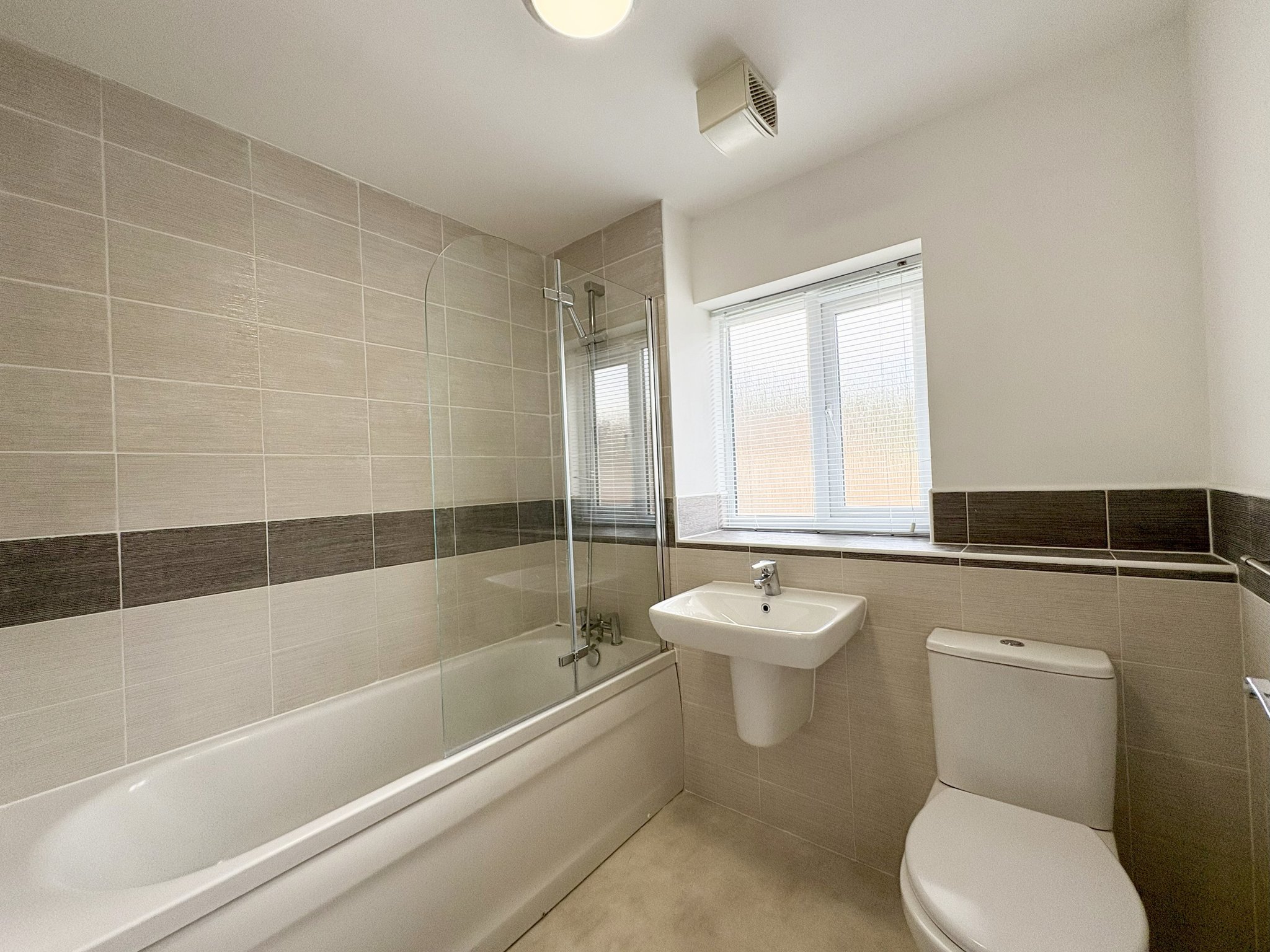 Family Bathroom comprising a white suite with bathtub and shower over, hand basin, WC, part tiled walls and flooring, obscure rear window, single pendant light fitting, and radiator.