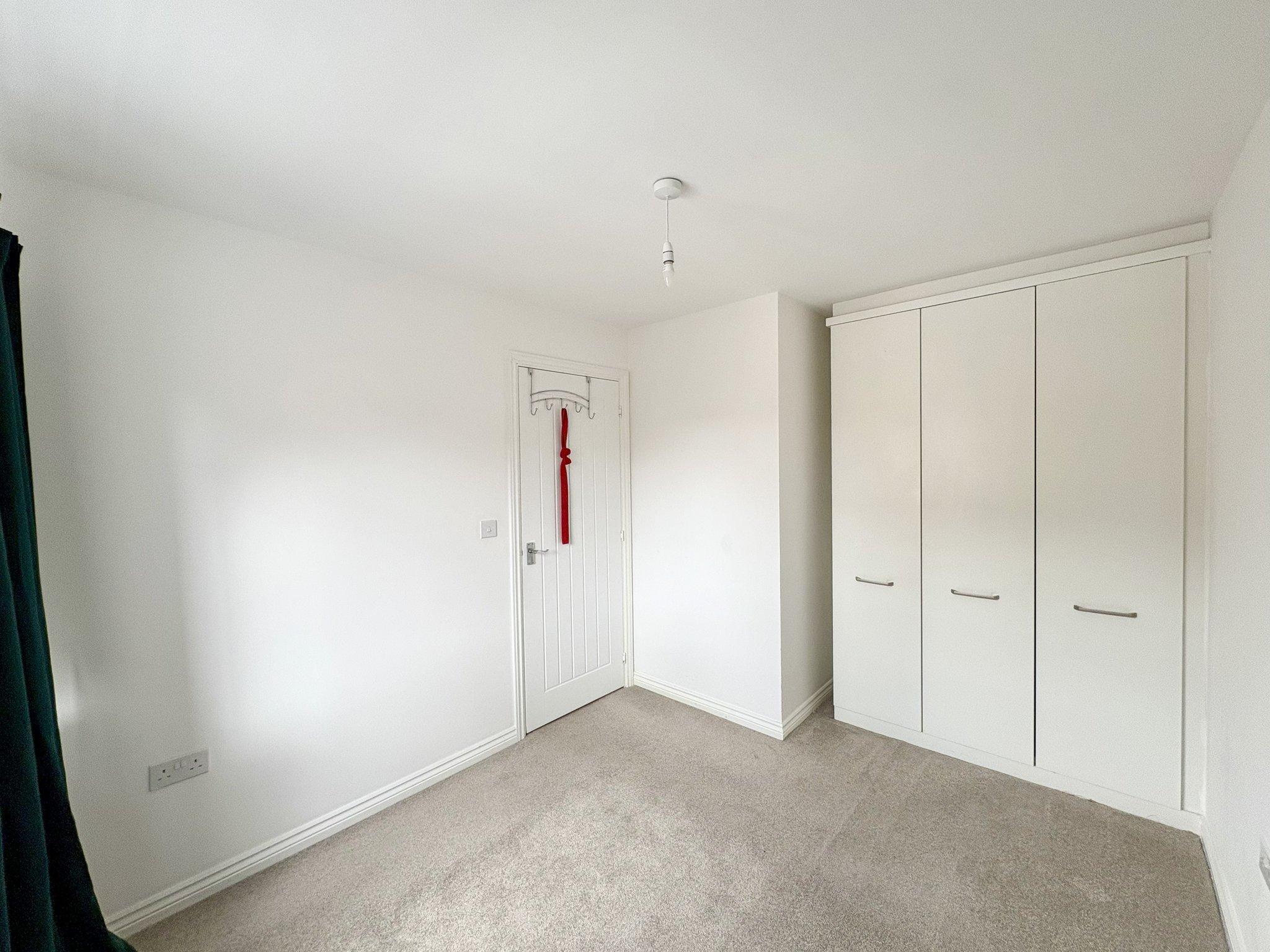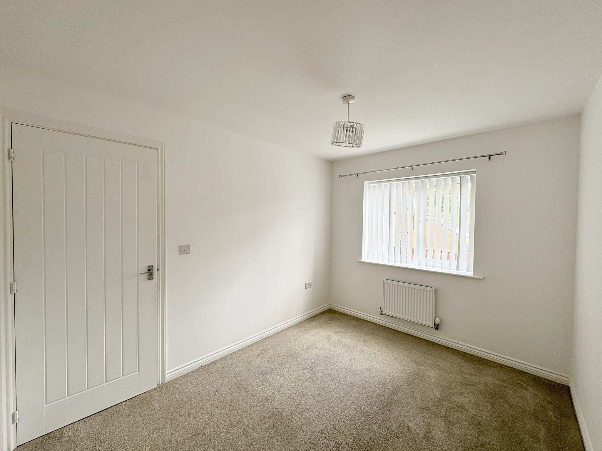 Bedroom Two - Spacious double room with a rear-facing window, soft carpet, radiator, and pendant light.