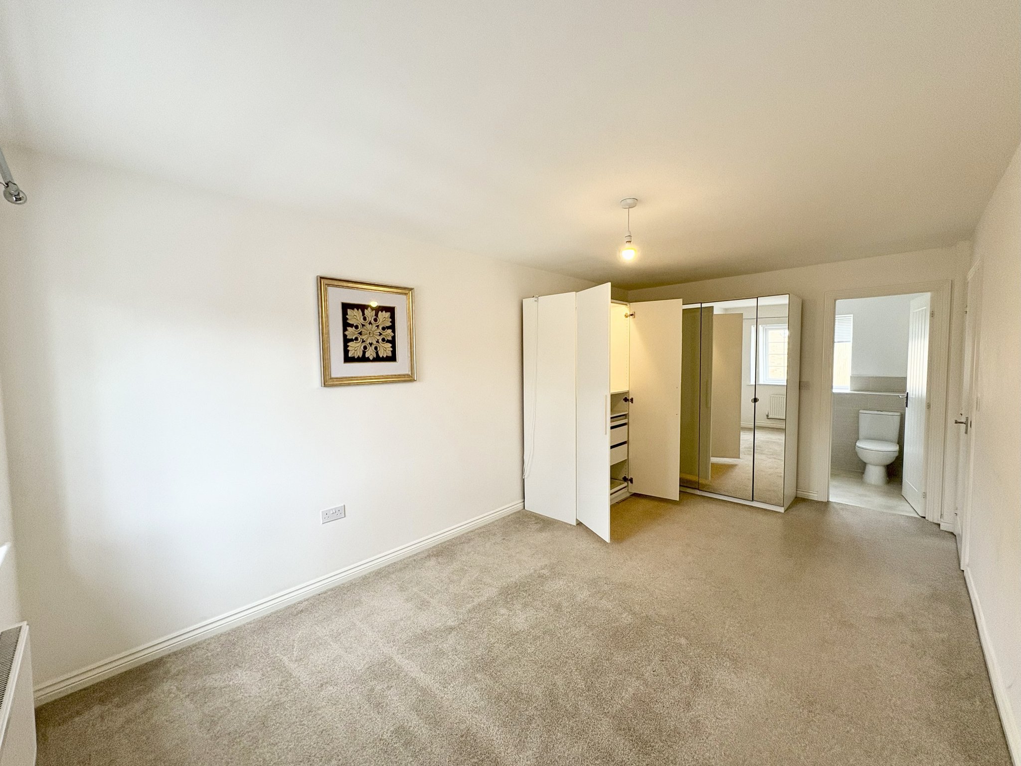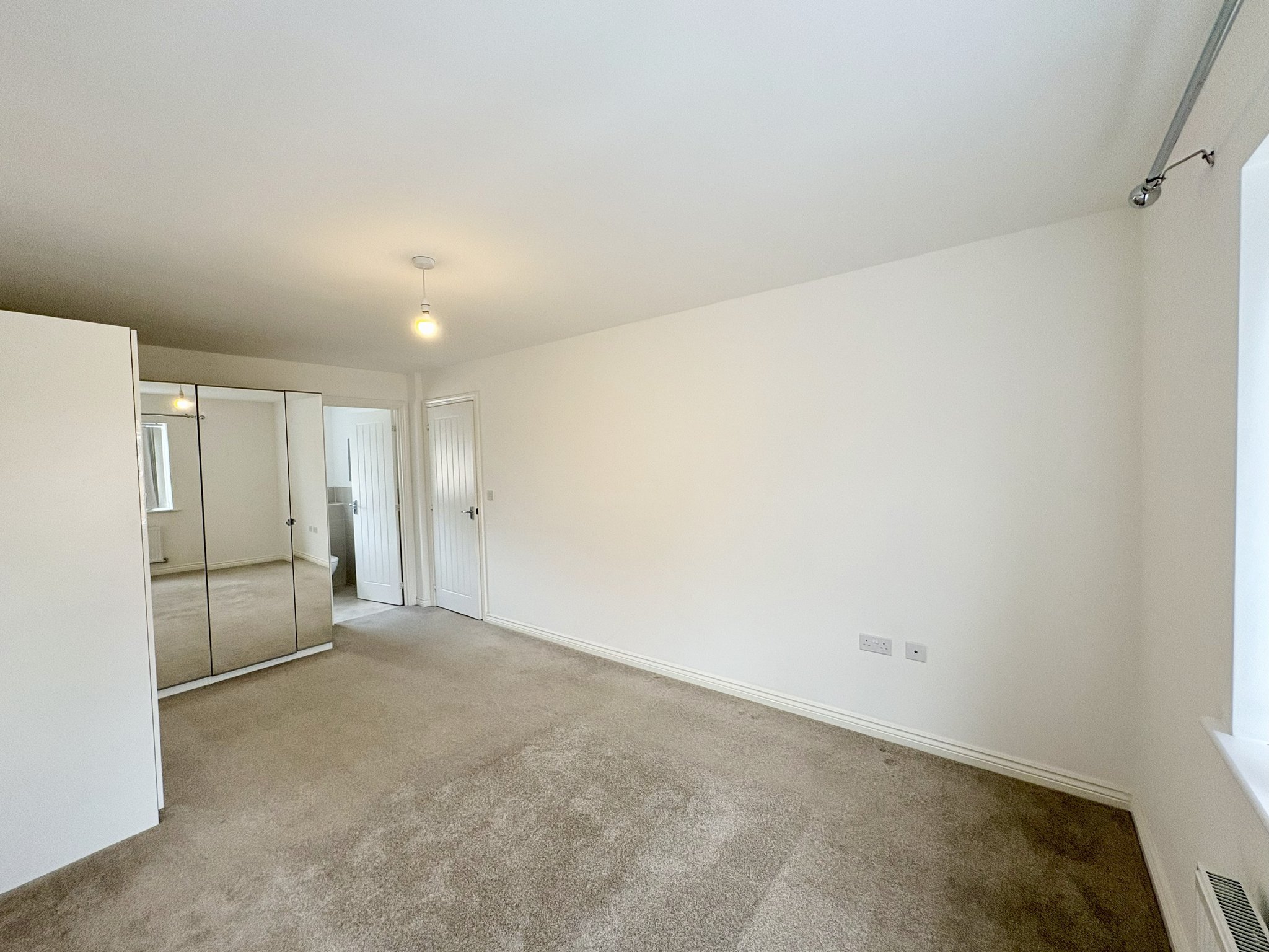 Principal Bedroom - A large double bedroom with front-facing window, fitted carpet, radiator, and single pendant light. Access to private en-suite.