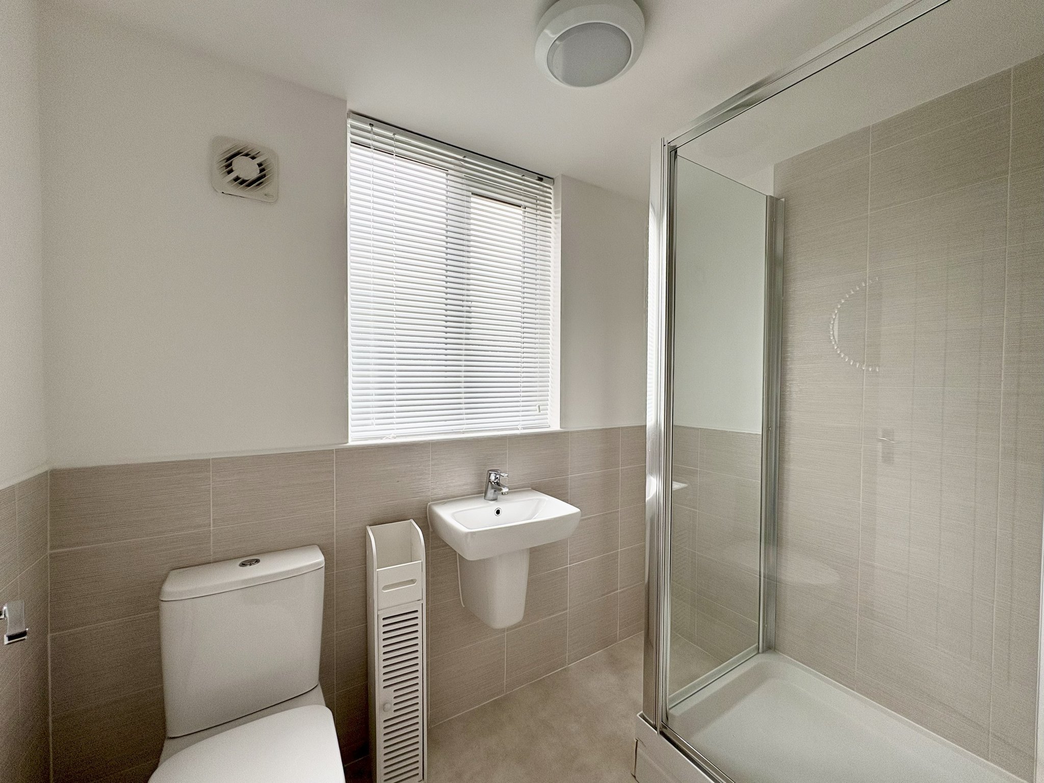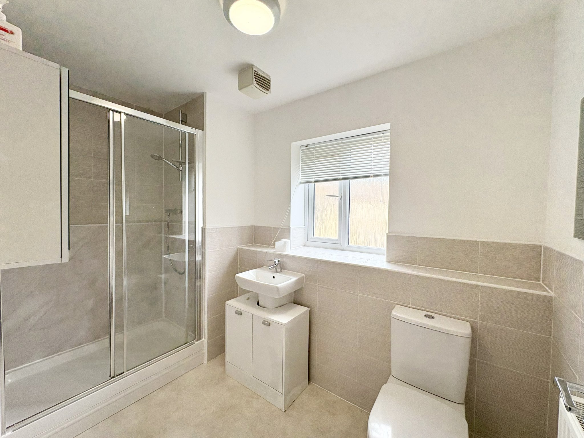 En-suite finished with a walk-in double shower and glass screen, vanity unit with hand basin, WC, fully tiled walls and floor, rear obscure-glass window, single pendant light fitting, and radiator.