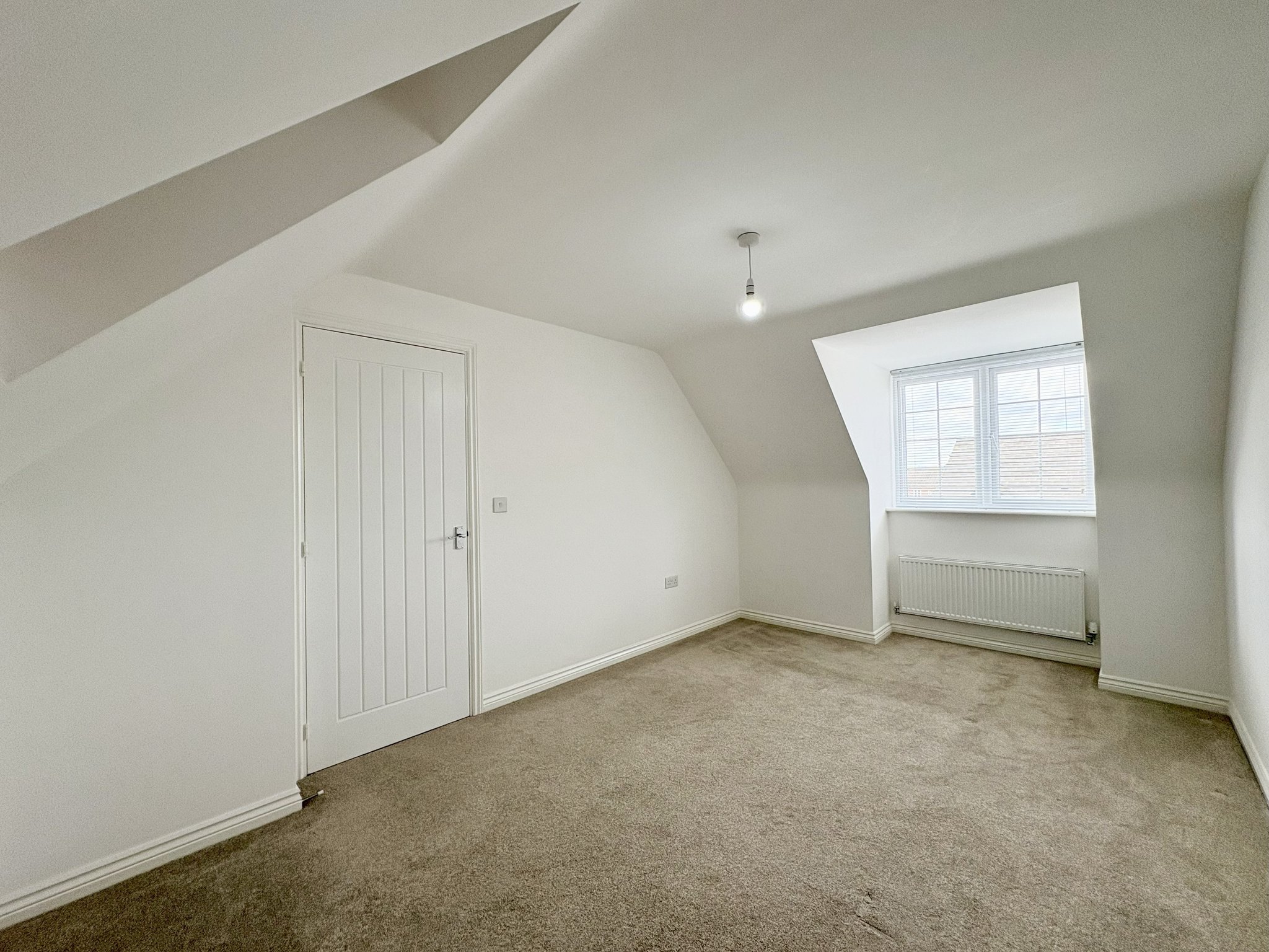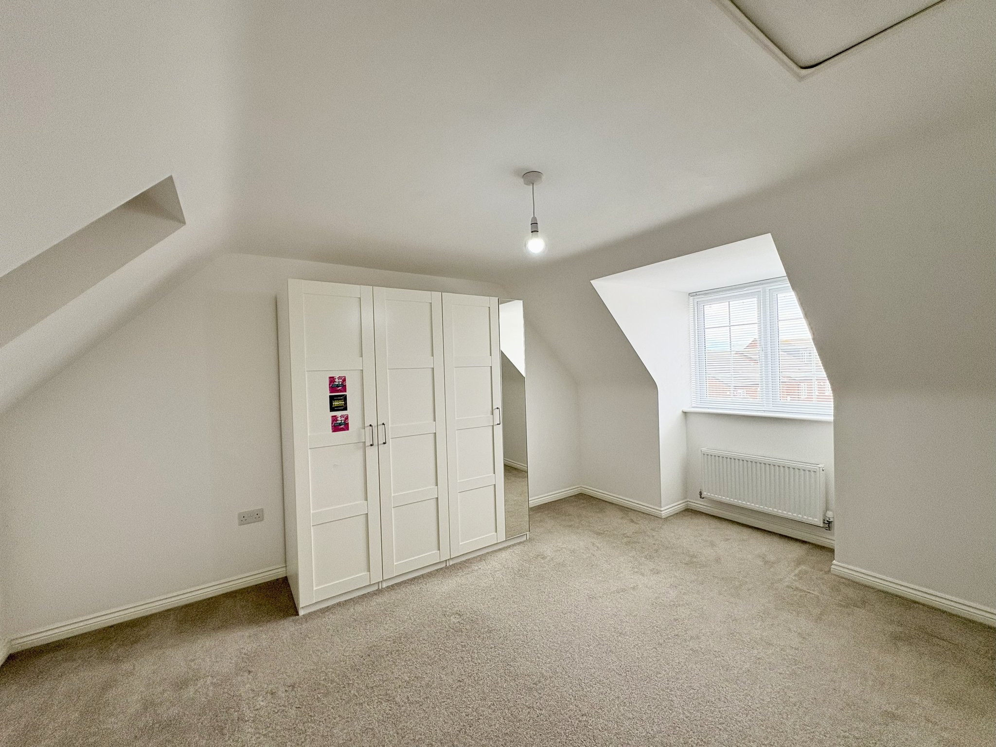 Bedroom Four is a double bedroom with front aspect dormer window and rear Velux skylight. Features soft carpet, radiator, and pendant light.