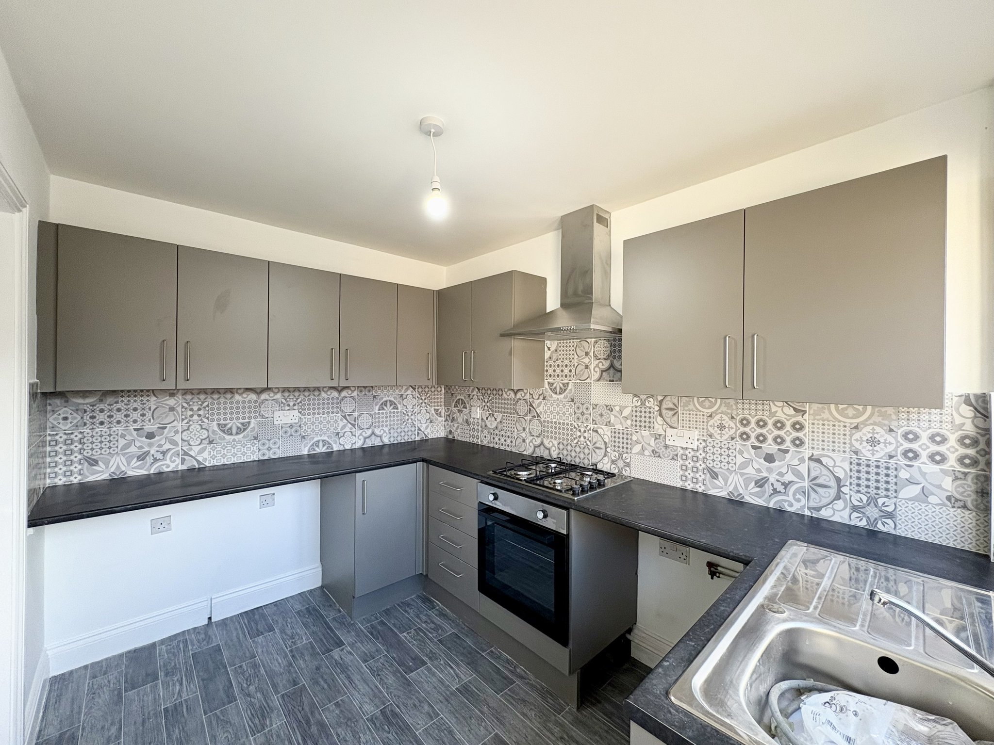 The new fitted kitchen is thoughtfully arranged and featuring ample storage and countertop space to create your ideal cooking environment with integrated oven, hob and extractor hood. There is plumbing for the washing machine and space for a fridge freezer. Large window allows daylight to flood in, creating a bright and airy place to prepare meals and enjoy casual dining.