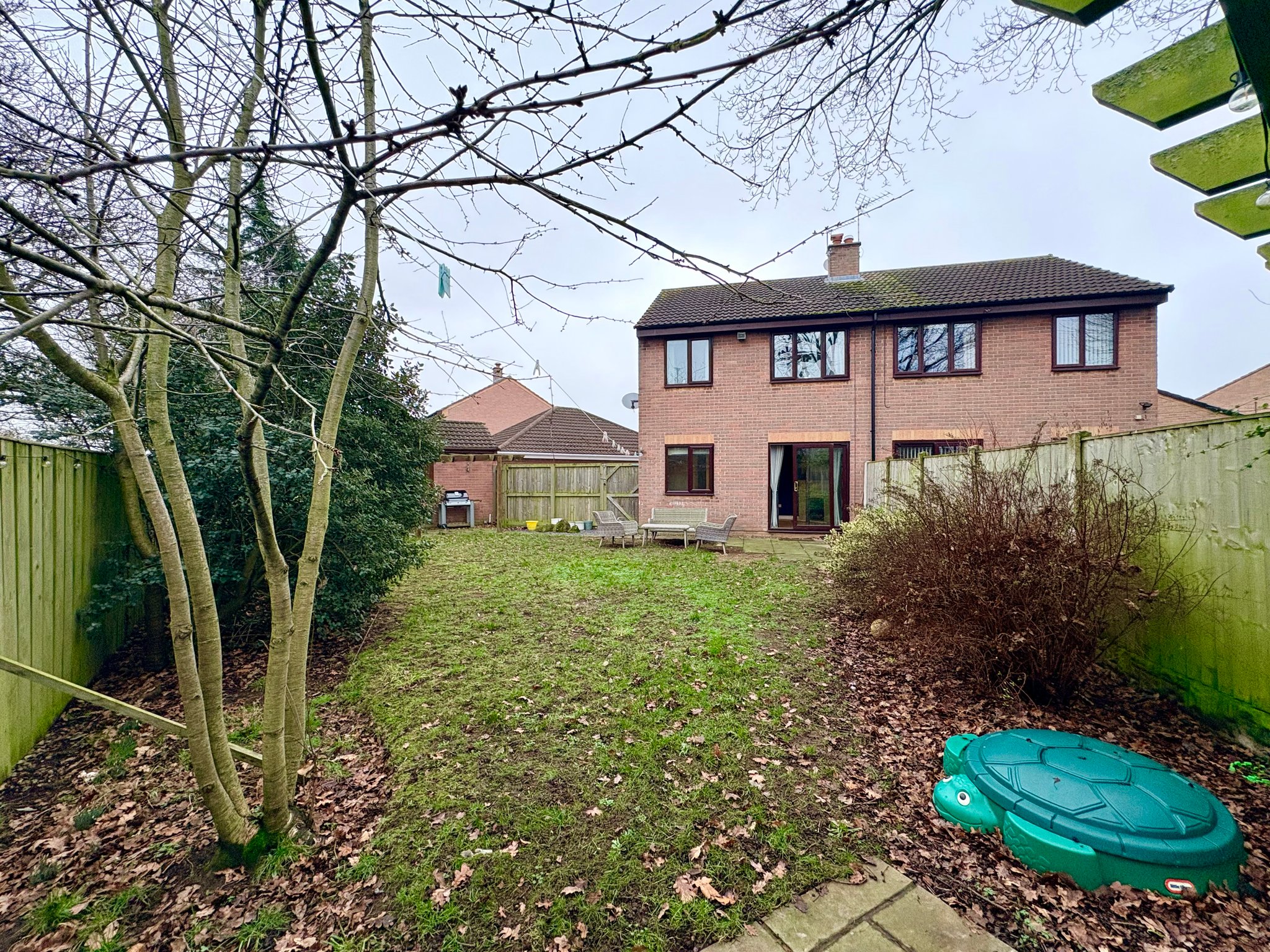 The property enjoys a particularly generous rear garden due to its corner plot position. The garden is mainly laid to lawn, not overlooked, and features three separate patio areas along with established shrub borders, making it ideal for outdoor entertaining and family use.