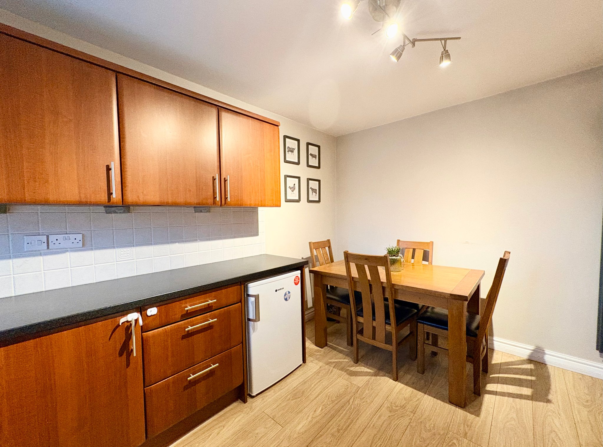 The stylish kitchen/breakfast room is fully fitted with a range of wall and base units with contrasting worktops. Integrated appliances include an oven, gas hob with extractor hood, with space for a fridge and plumbing for a washing machine. There are 2 front aspect windows and a dedicated dining area with space for a dining table. The laminate flooring continues from the hallway, creating a seamless flow throughout the ground floor. Additional features include a radiator and spot lighting.